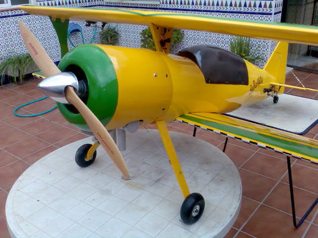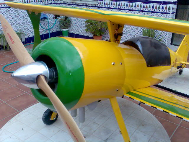:D Hola de nuevo, la Pitts esta acabada :D :D Tan solo comentar que sigo esperando que algun alma caritativa se "moje" y me opine sobre lo que comente en el post anterior, no me puedo creer que nadie diga nada :cry: Las dos pequeñas modificaciones que os dije que iba a hacer han sido ponerles unos cables a las agujas del motor para poder ajustarlas sin desmontar nada. Me he inspirado=copiado :D en un sistema que trae mi OS 91, pero soldando los cables a las cabezas de las agujas. La otra modificacion ha sido ponerle una ballesta adicional al tren de aterrizaje, pues con la unica que tenia de 4 mm. estaba "blandengue" para el peso del avion. Por lo demas, solo falta acabar el rodaje (unas dos horas) y el estreno, del que prometo poner un video cuando lo haga, ya que no hay fecha concreta (en este mes es la feria en Sevilla, la comunion de mi hijo, etc.) y lo voy a tener complicado.