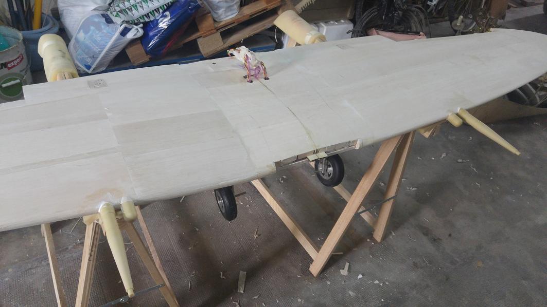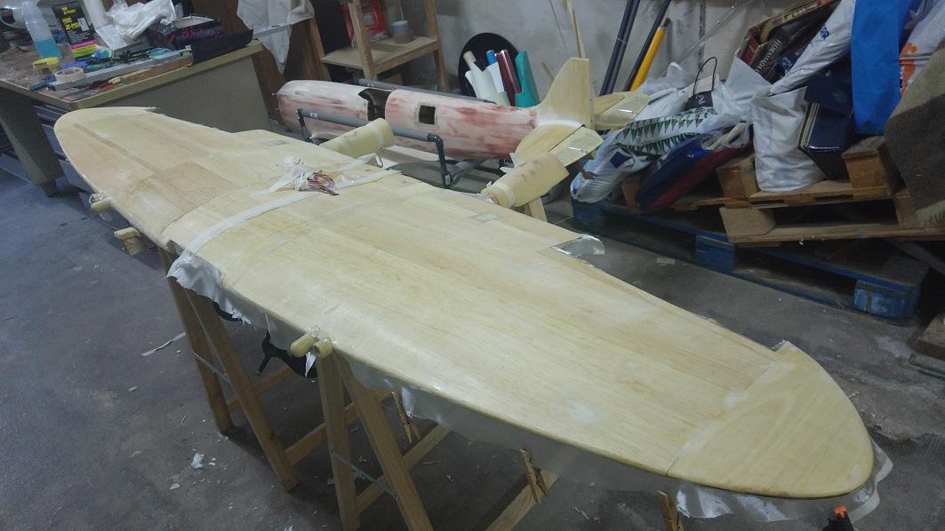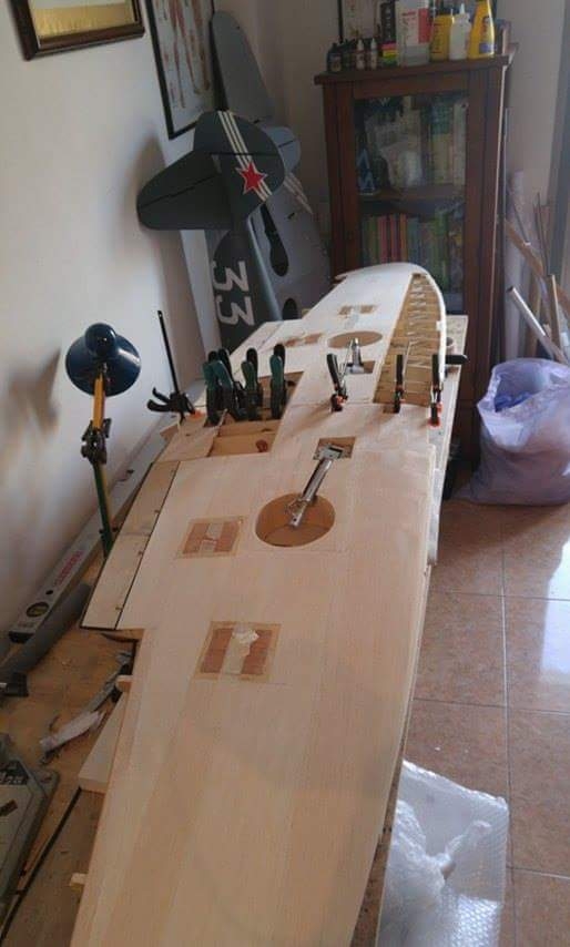 Vigila el peso y enfibra lo mínimo, yo utilicé velo de 20 gr y la resina justa y con todo estoy en 8 kg con el avión terminado, con 2120 mm de envergadura y algo mas de 1800 mm de longitud, que con el cono de 125 mm se irá a los 2 metros, me falta ajustar el CG, a ver cuanto peso extra tengo que poner al final en el morro, en una primera apreciación estaba entre 1-1.5 kg, si al final me quedo en 9 kg en orden de vuelo me doy con un canto en los dientes.