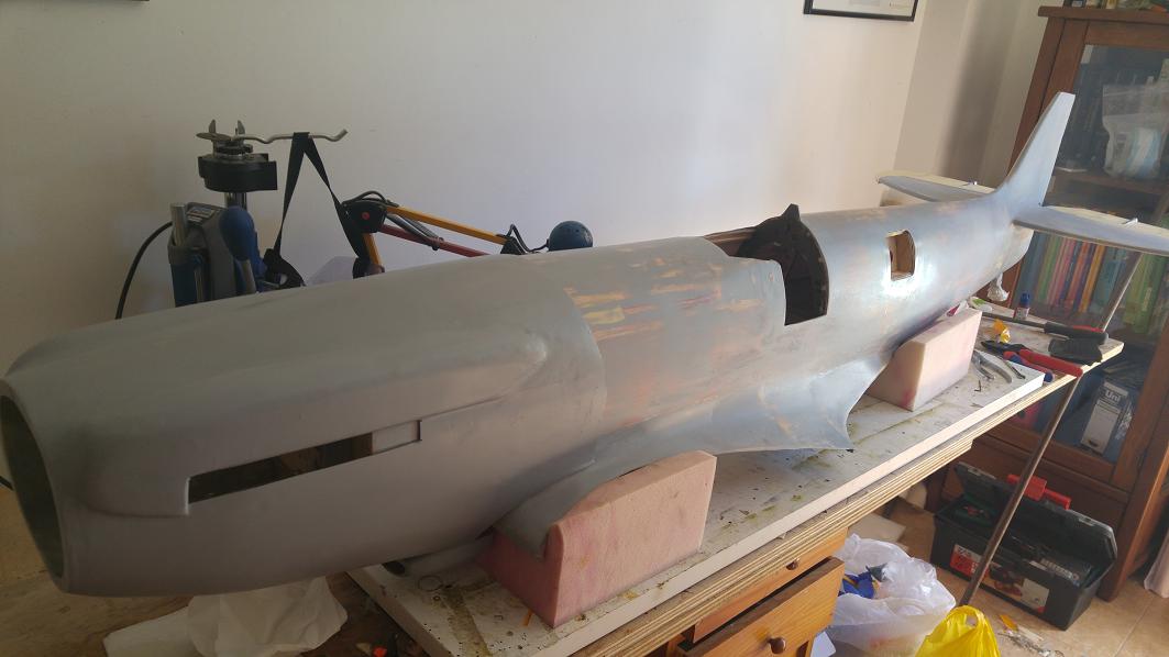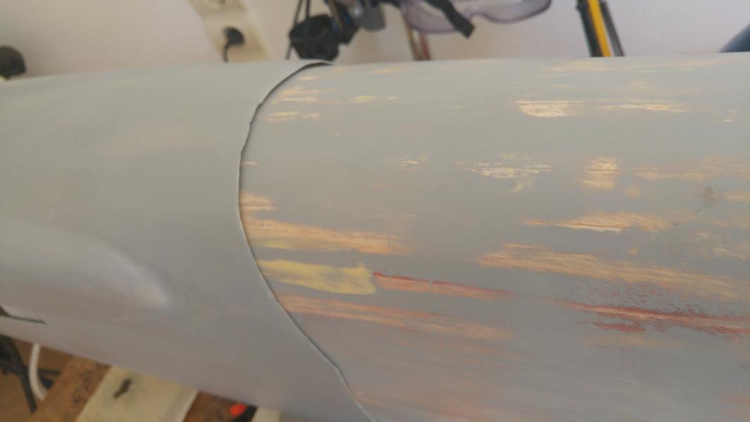 Hola Con el fuselaje enfibrado,y aplicada la segunda mano de resina diluida.Después de dejar secar bien 2 dias,lo he lijado con grano 80.Después la primera mano de imprimacion para que empiezen a salir defectos.para corregirlos he utilizado masilla acrílica de automoción.El siguiente paso es lijarlo todo con papel al agua de grano 120.