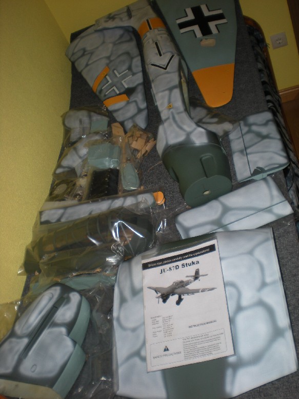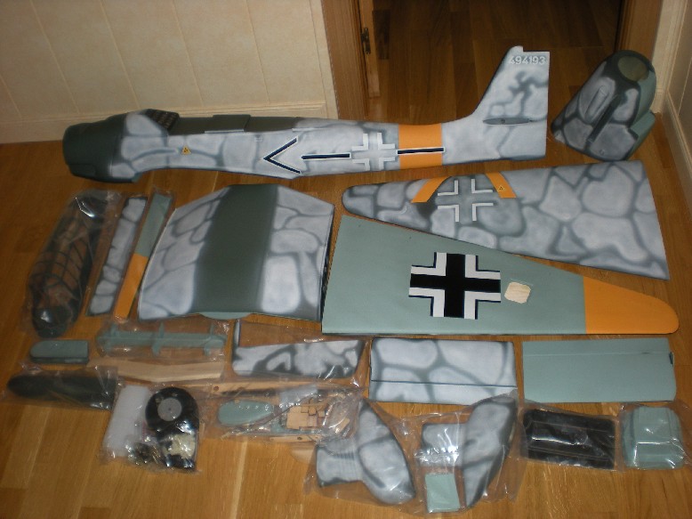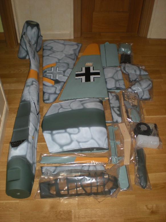El avión viene muy bien embalado, con cada pieza metida en bolsas de plástico y fijadas con pegamento. El fuselaje es de fibra de vidrio, así como la parte central de las alas, los patucos para las ruedas y la carena; el resto de piezas son de balsa y contrachapado. Las únicas piezas enteladas son las semialas.