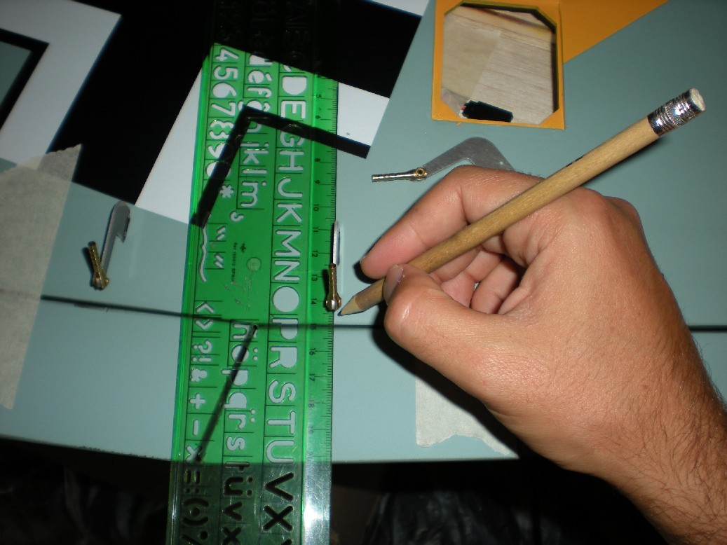 Usamos una regla de calidad :wink: para asegurarnos que la bisagra queda perpendicular al borde de salida del ala (en realidad usé una escuadra) y marcamos los agujeros para meter las bisagras en los alerones y flaps.