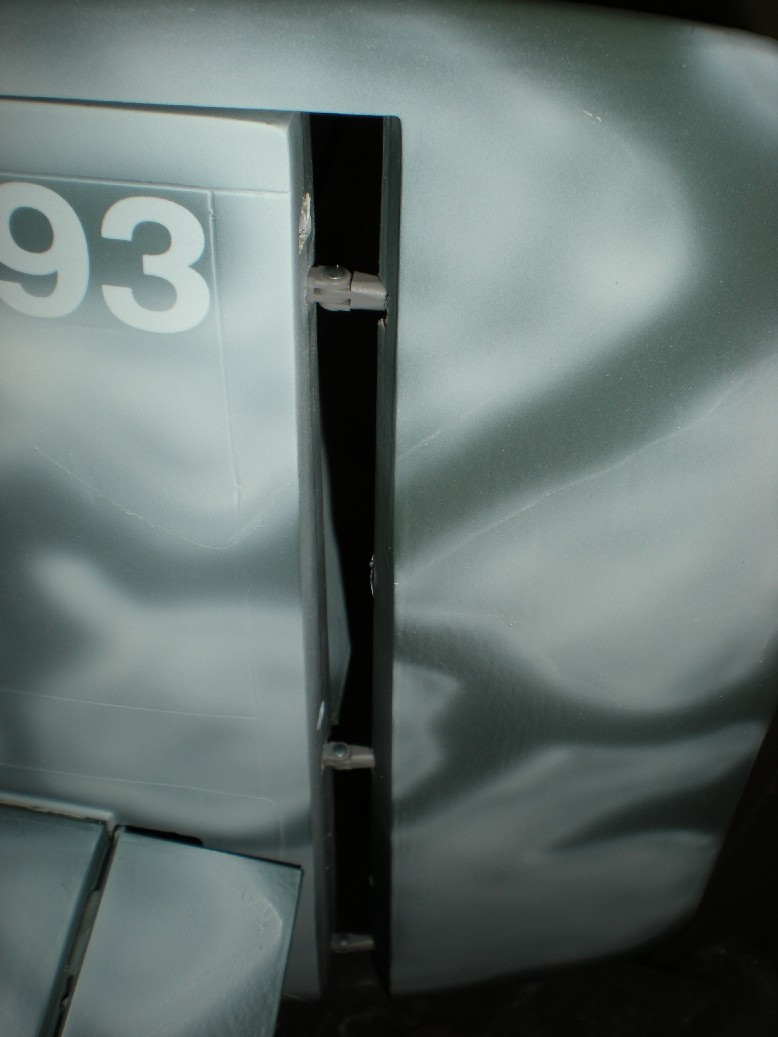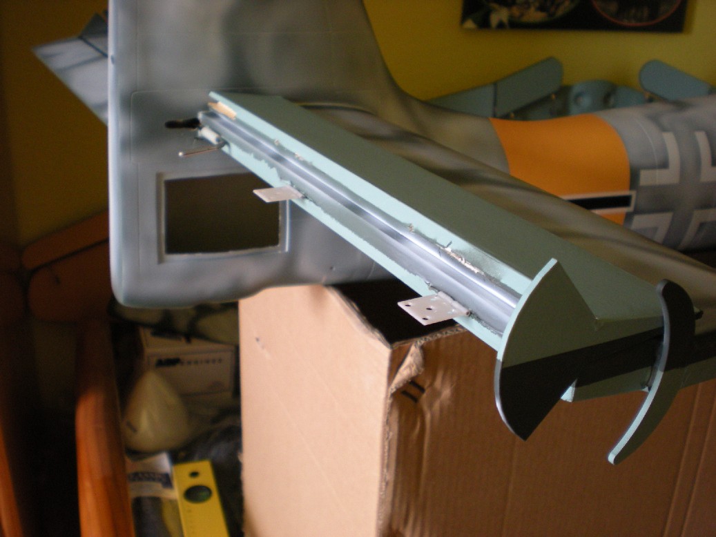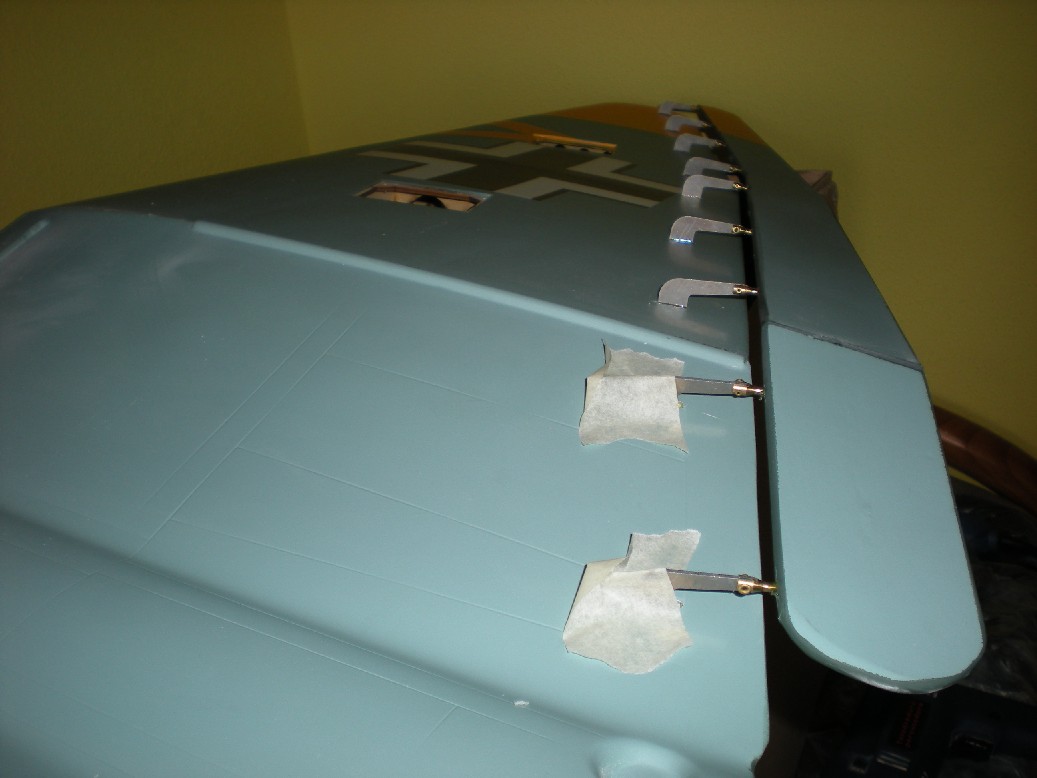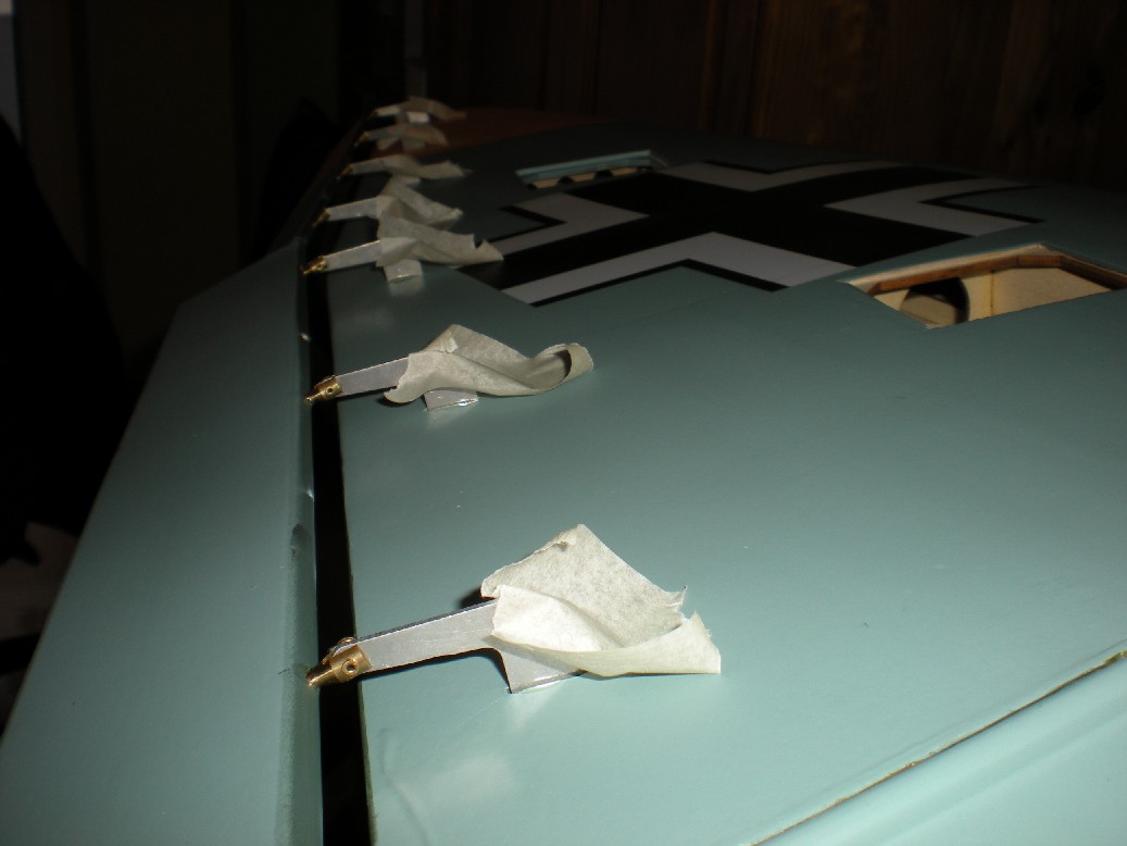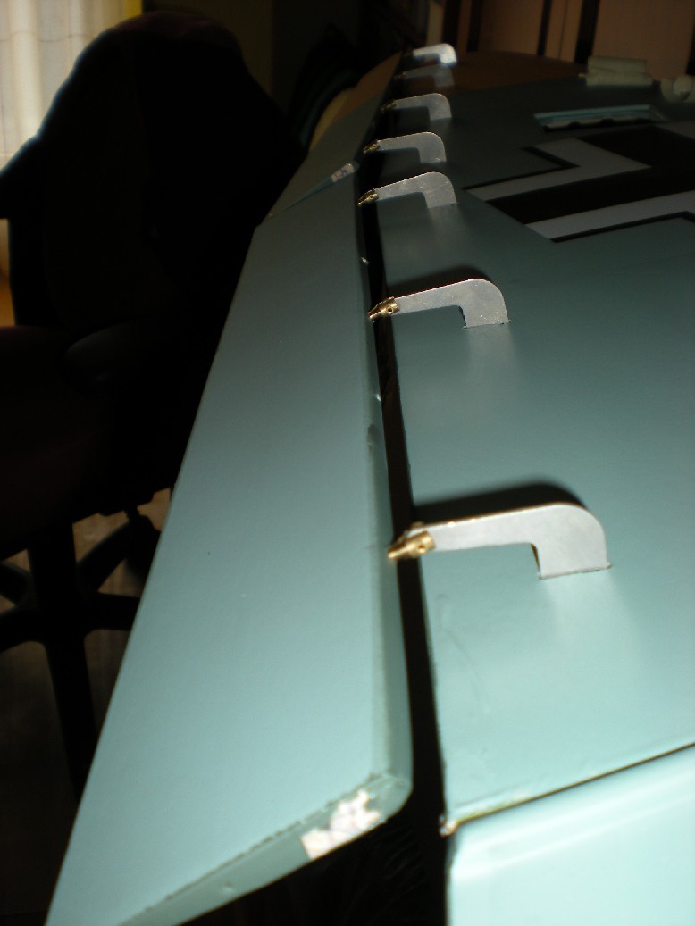 Presentamos los alerones y flaps con las bisagras en su sitio (anteriormente hay que comprobar que todas las bisagras entran en sus ranuras y modificar las que no estén correctas) y vemos que hagan el juego bien. Puede que alguna bisagra tienda a subir y bajar un poco junto con el alerón y hay que corregirlo (sacando o metiendo un poco la bisagra del alerón).
