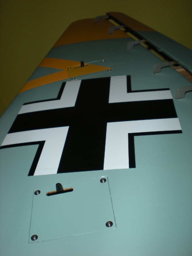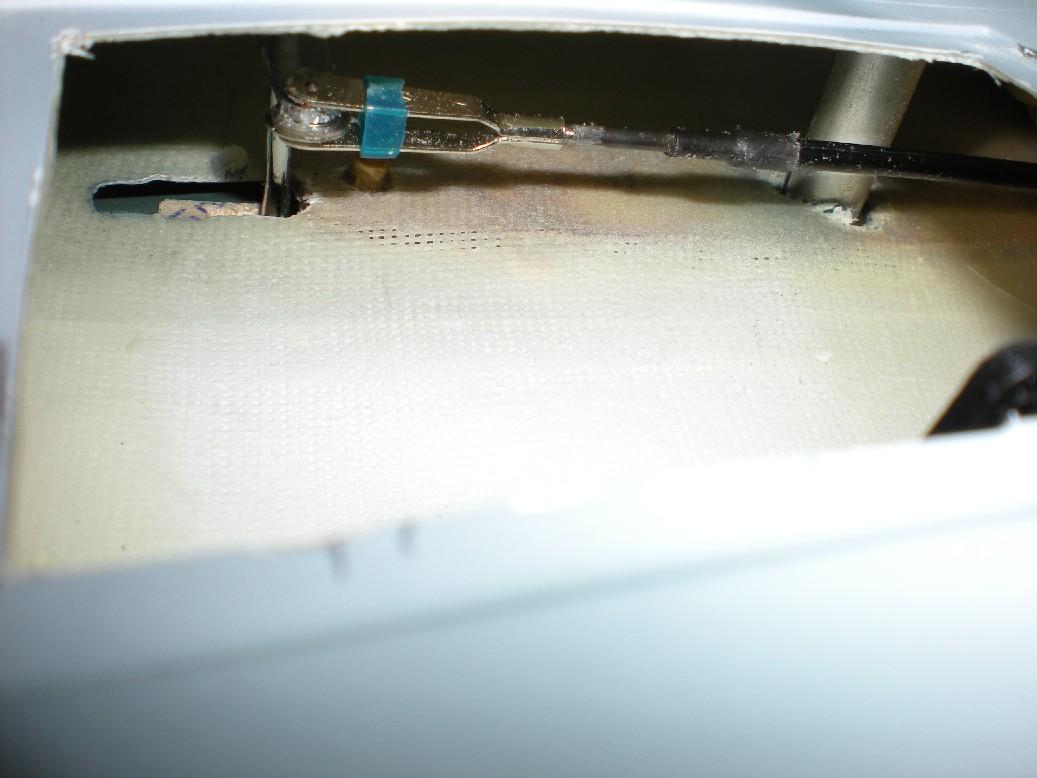Finalmente se ponen las varillas de mando. Los horns que vienen con el kit no llegaban a abarcar el aleron/flap y los cambié por otros más adecuados (unos Robbe con rótulas).