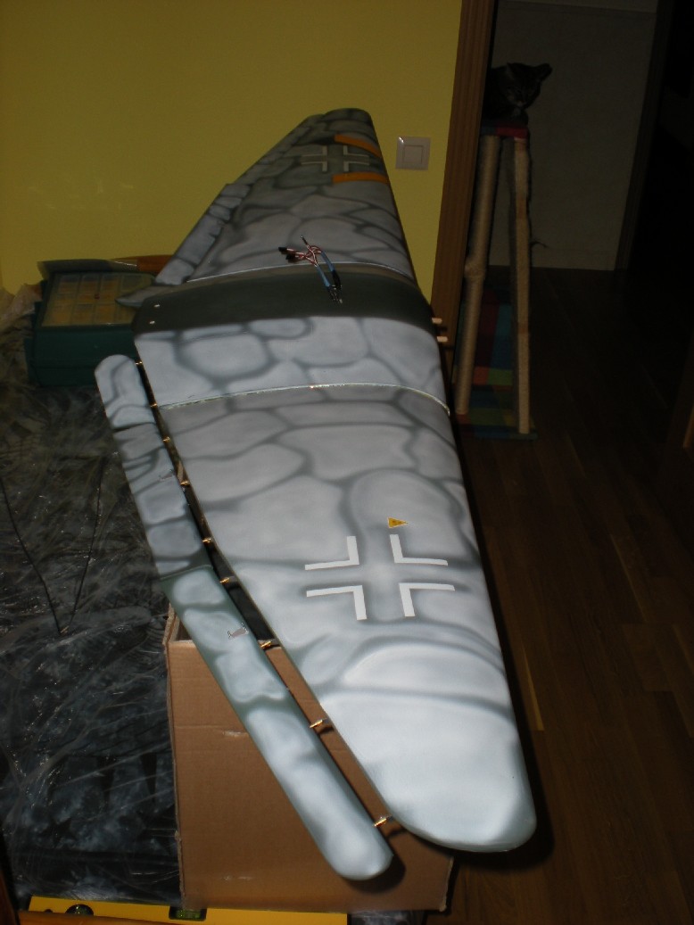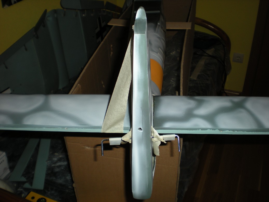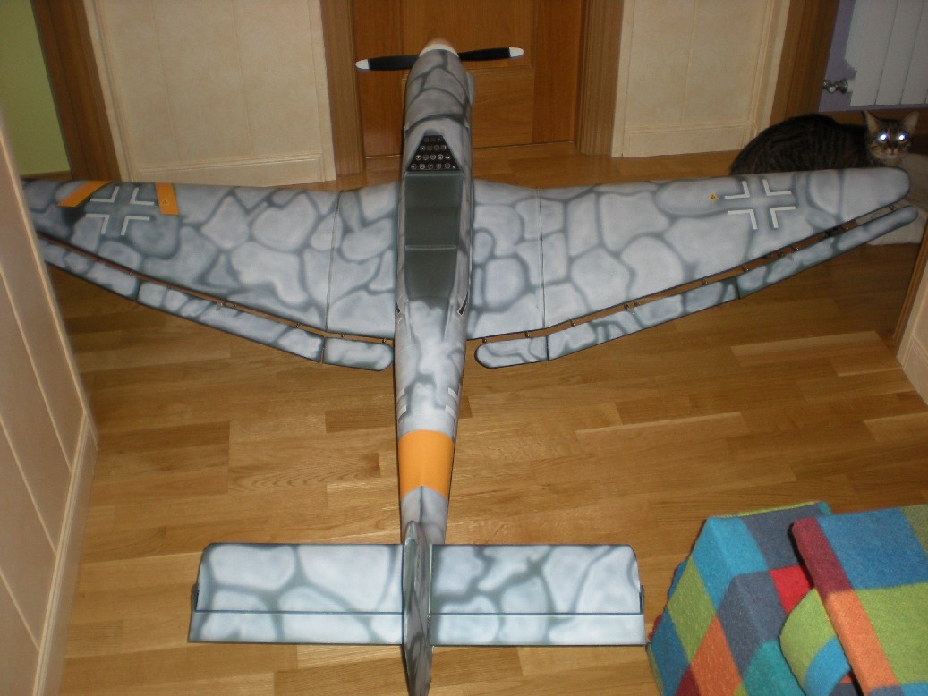 Ya que he probado que vuela, ahora continuaré poniendo los patucos para las ruedas, los radiadores, la antena, los refuerzos para el estabilizador horizontal, los cañones antitanque, etc. Vamos que ahora toca tunearlo.