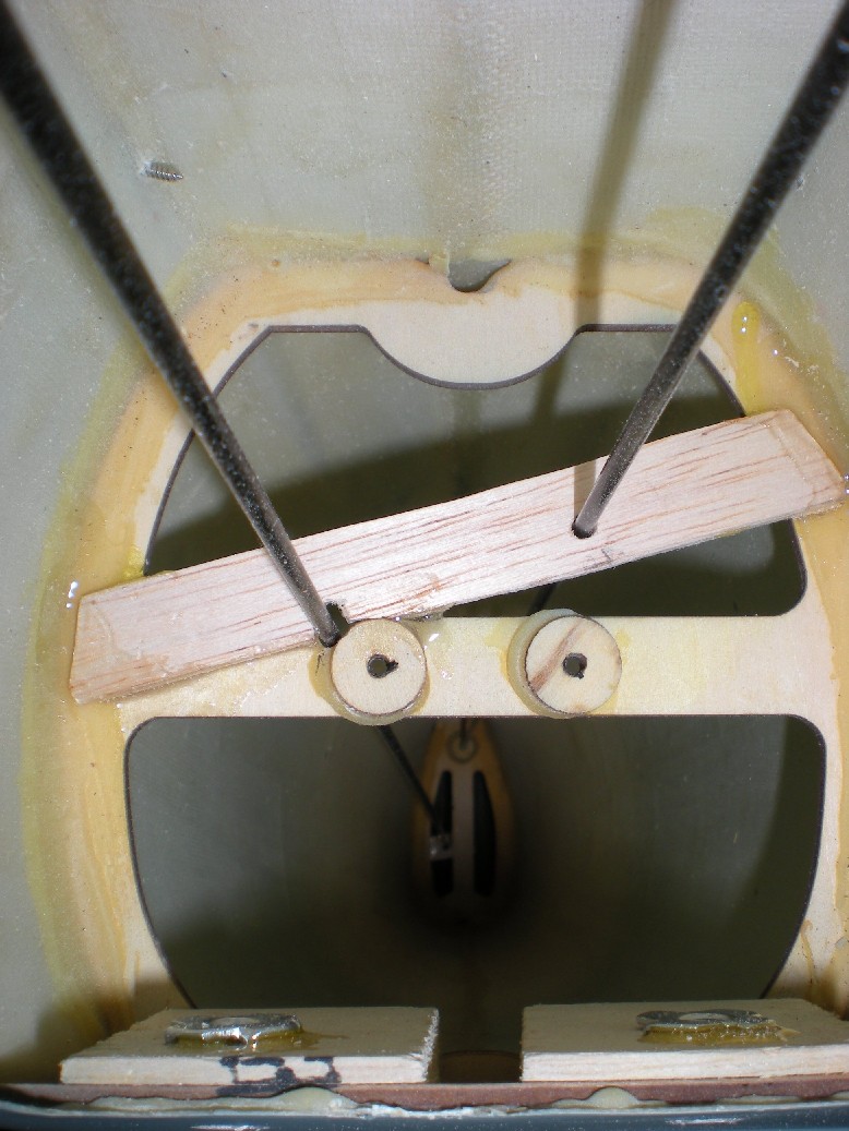 Luego hay que instalar las partes de los flaps que van en la sección central, que además hay que hacer las ranuras para las bisagras, pues no tiene. Se procede igual que con los alerones, pero antes de meterlo en su sitio hay que introducir un cable de acero trenzado entre los flaps de la semiala y de la sección central para que se muevan a la vez (es recomendable pegarlo con epoxi sólo en uno de los lados para que tenga algo de juego).