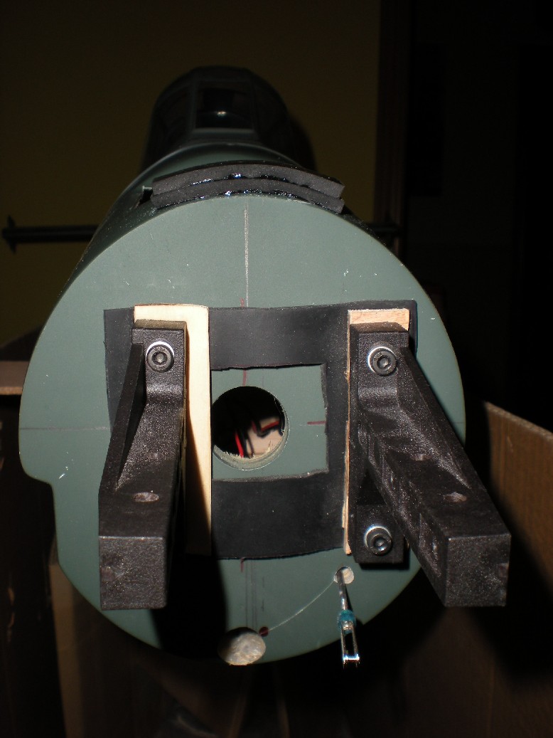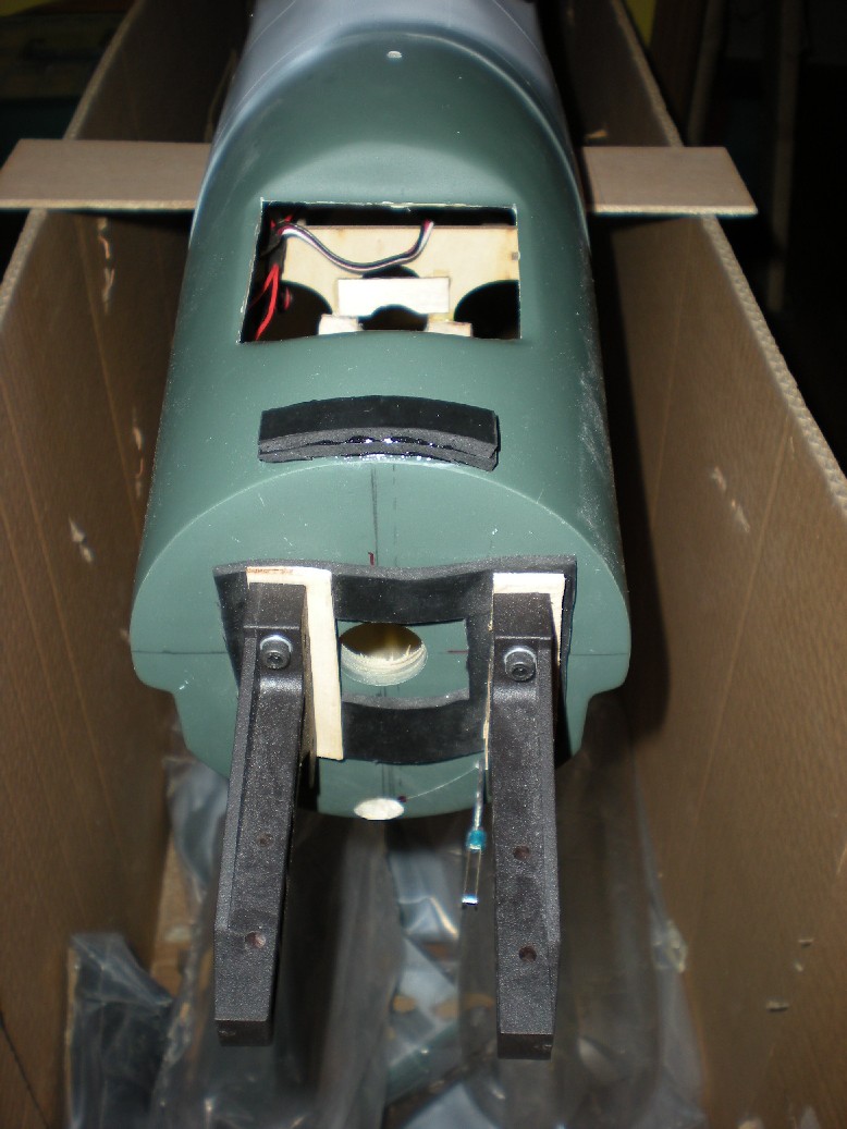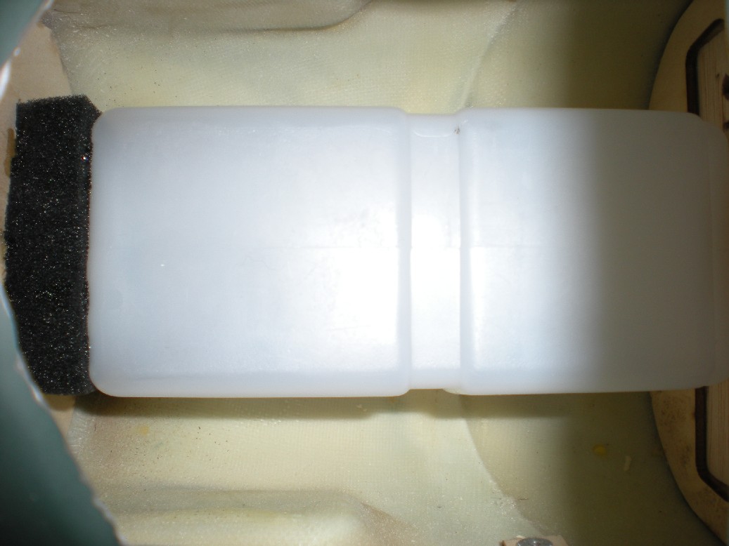 Hice otro agujero en la parallamas para pasar los tubos (y ya van tres) y monté el depósito. Va fijado con velcro a los soportes del fondo y fijado con dos trozos de espuma entre la parallamas y la pieza de contrachapado que delimita con la bandeja de servos (la posición antigua del depósito).