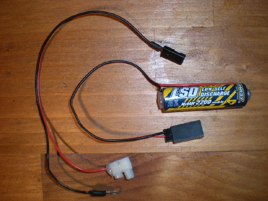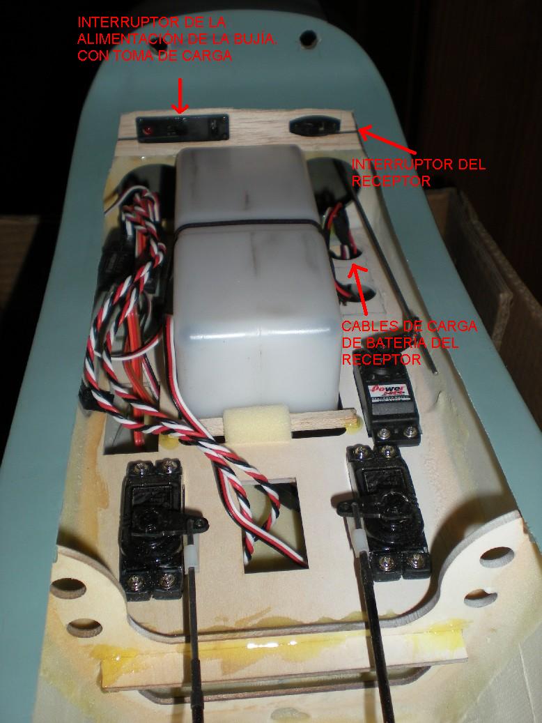 En ella se puede ver el nuevo interruptor del receptor, con toma de carga, y el cable alargado para equilibrado de la batería sin desmontarla.