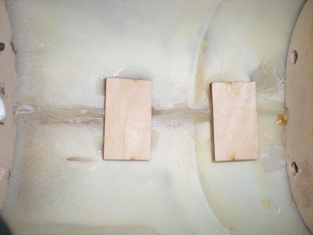 Para ello hay que lijar las superficies a pegar de las semialas y de la sección central para quitar la pintura y hacer la superficie más rugosa, especialmente la sección central que es de fibra de vidrio y viene lisa como un cristal. Entre las semialas y la sección central va una bayoneta de contrachapado bastante gruesa y dos espigas de madera (una en cada extremo). Hay que hacer los agujeros para meter las espigas (con una plantilla que viene en el kit) y que todo quede bien alineado y robusto al meter las bayonetas.