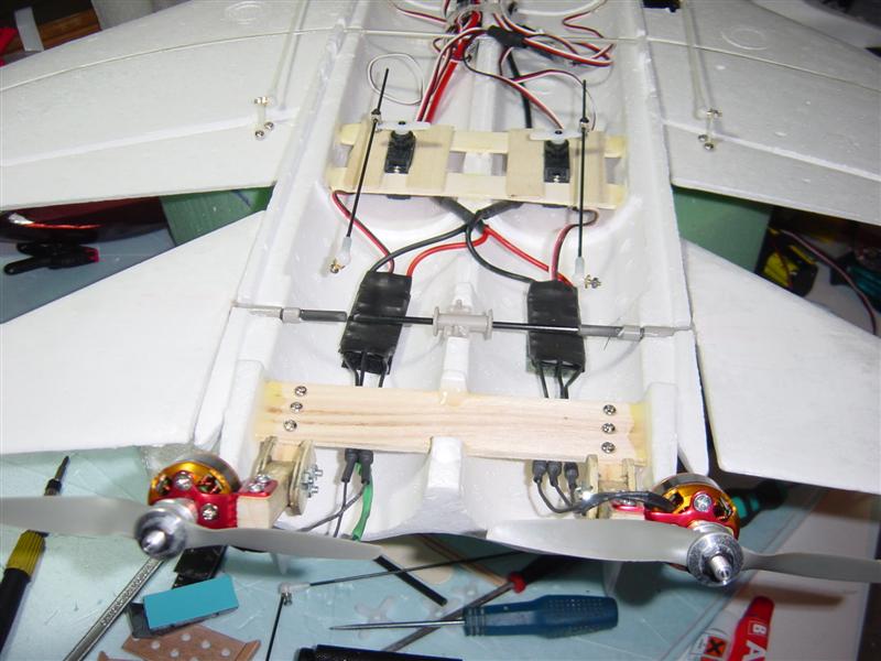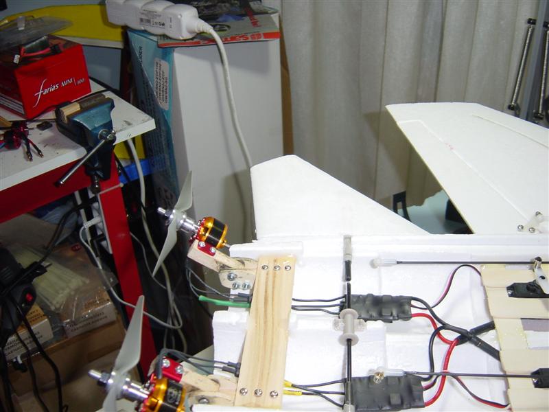 saludos y os cuento cuando vuele como va, por cierto lo he puesto con mezcla de flaperones, para que mueva juntos alerones y profundidad, espero que asi maniobre mas rapido, los motores son scorpion 1980 kv, cada uno y helices apc 5x5..
