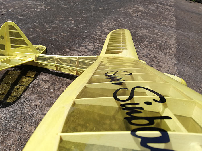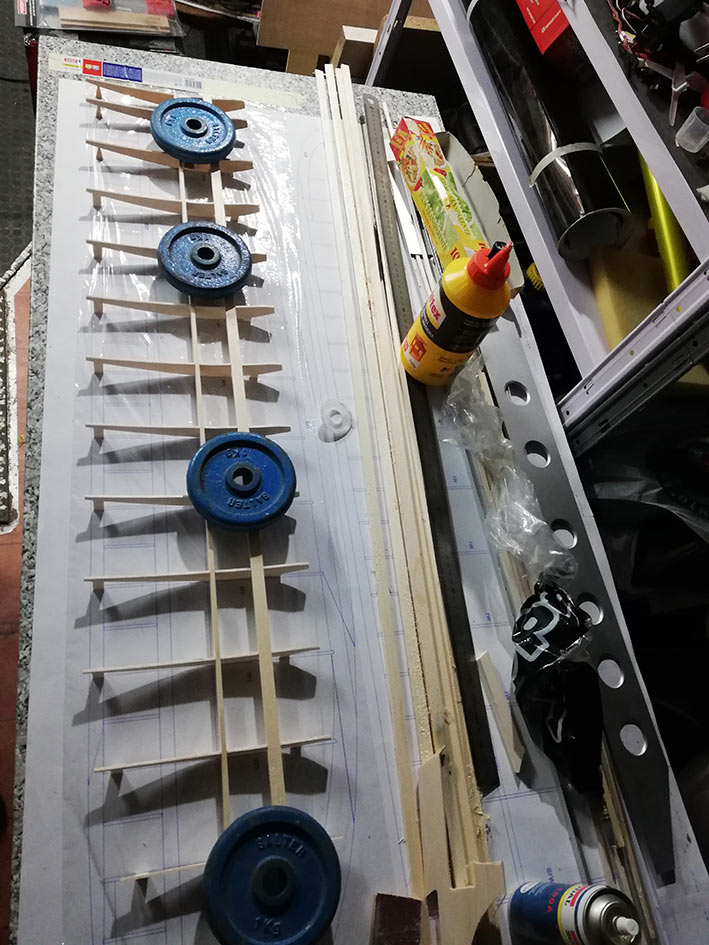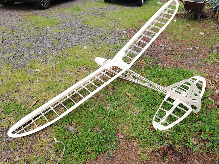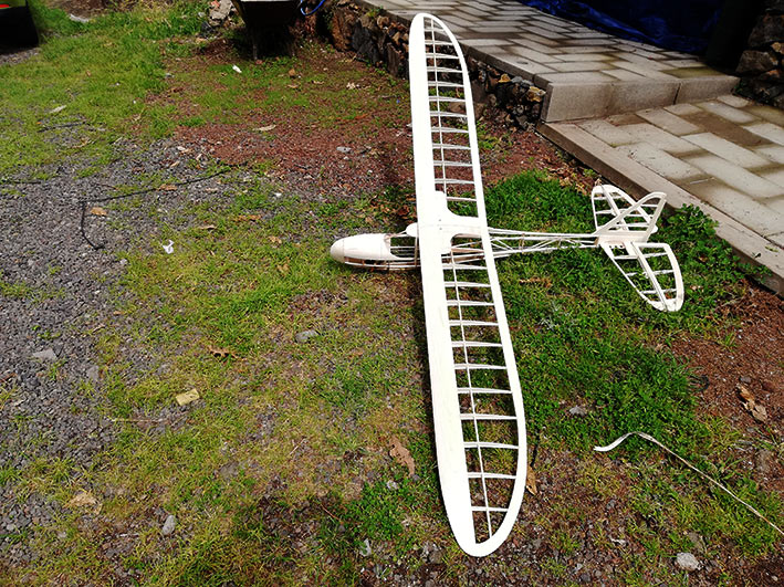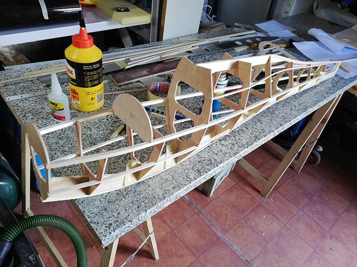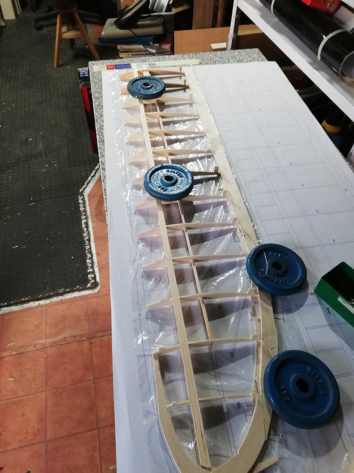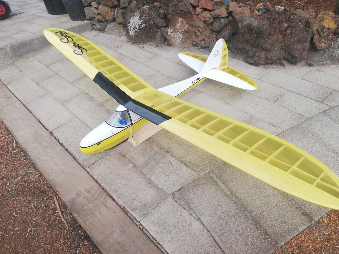 Tiene una envergadura de 2,36 mt, y el fuselaje está construido en dos mitades, palitos y cuadernas, aunque estás últimas las hice un poco distintas al plano original. El peso final se quedó en 1, 3 Kg, no está mal.