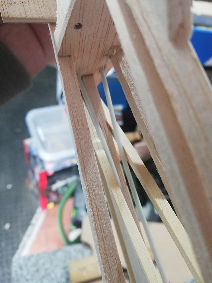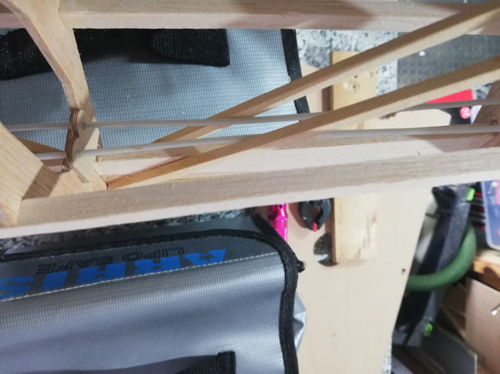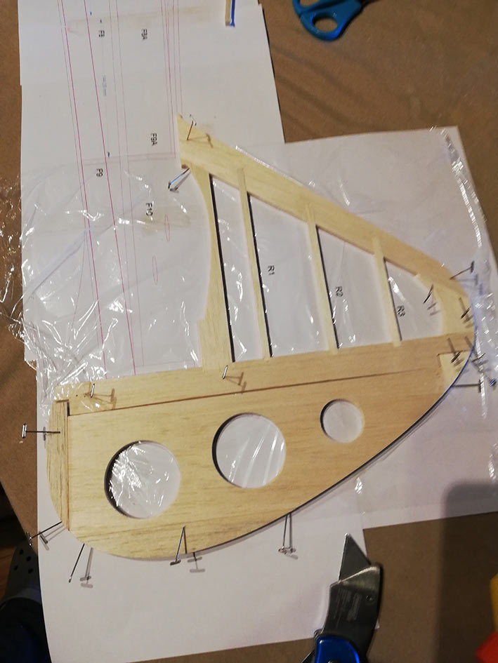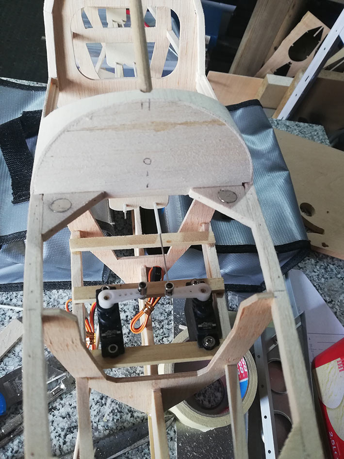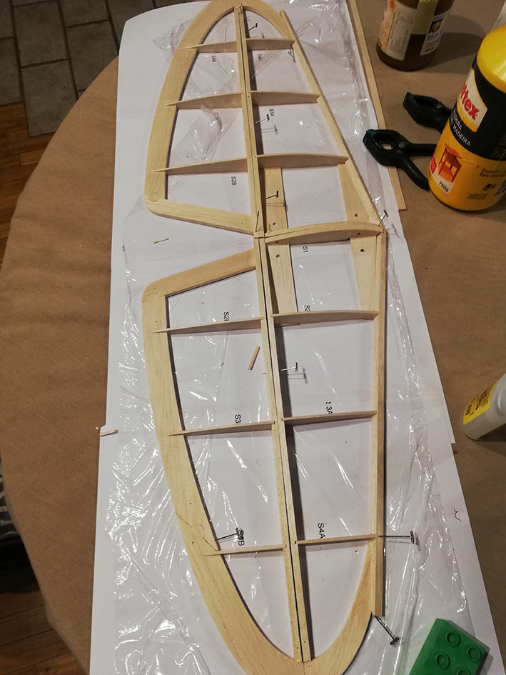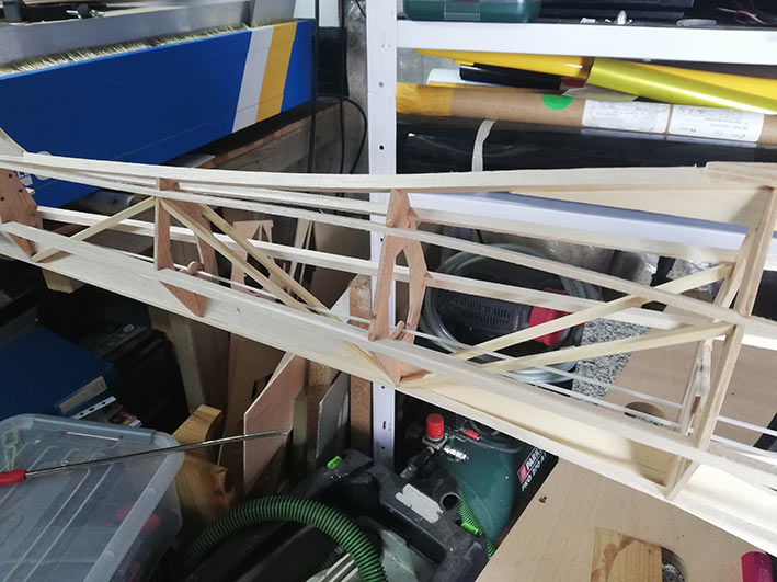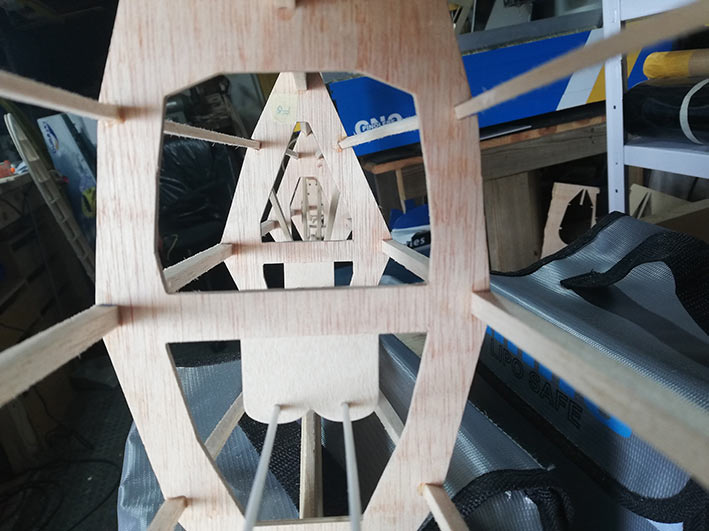 Tiene una envergadura de 2,36 mt, y el fuselaje está construido en dos mitades, palitos y cuadernas, aunque estás últimas las hice un poco distintas al plano original. El peso final se quedó en 1, 3 Kg, no está mal.