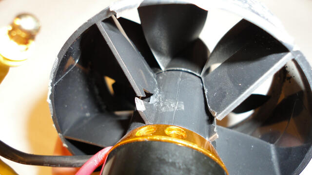 Pues si, los alabes que unen el aro exterior de la EDF con el soporte del motor se han partido, solo quedaba uno entero. Creo que he tenido mucha suerte de que no explotara en vuelo e incluso rompiera el avión en vuelo. Lo increíble es que hice un vuelo completo después de la rotura.