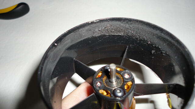 Por la tarde en casa, limpiando un poco el avión vi como carbonilla pegada en la boca del EDF, la quite con un destornillador y no le di importancia, pensé que algo se había pegado en el vuelo a la EDF.