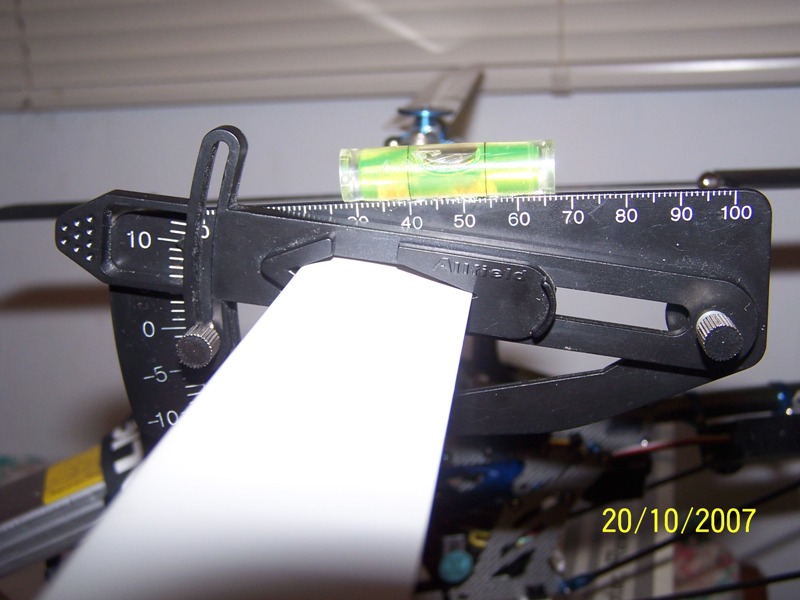 ve que el flybar está totalmente paralelo con el medidor de angulos, en la parte donde salen las medidas "parte superior")