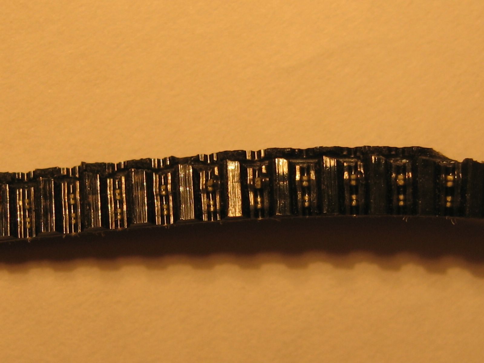 No sé el motivo, pero tengo aqui la correa y se empezo desgastando los dientes por un lado, por la cara interior, supongo que por roce con algo, aunque no he descubierto el por que, pero la acaba deshilando y rompiendo
