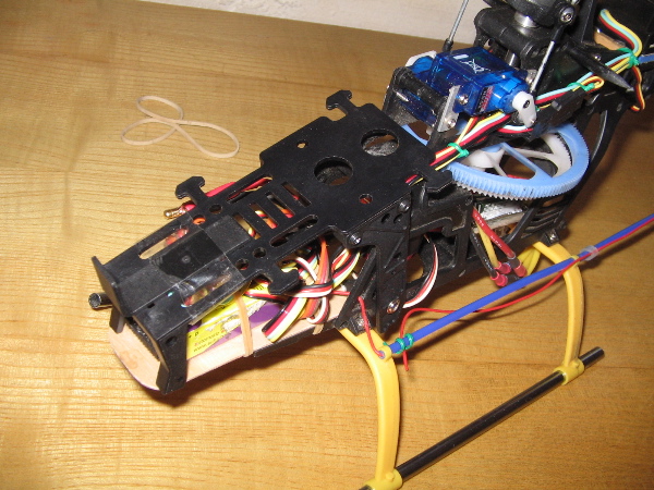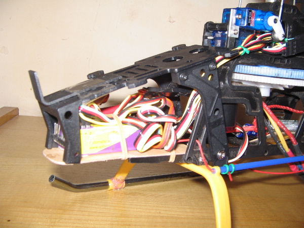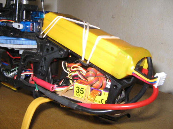 Le he puesto al Rex el soporte de baterias del Minititan que esta superbien y encaja estupendamente. Con ello gano algios gramillos de peso, pero como son en el morro pues me va bien para el centrado del heli. La bateria queda mas elevada, favoreciendo el centro de pesos del heli y por ultimo el receptor queda superlejos del variador y mas protegido....