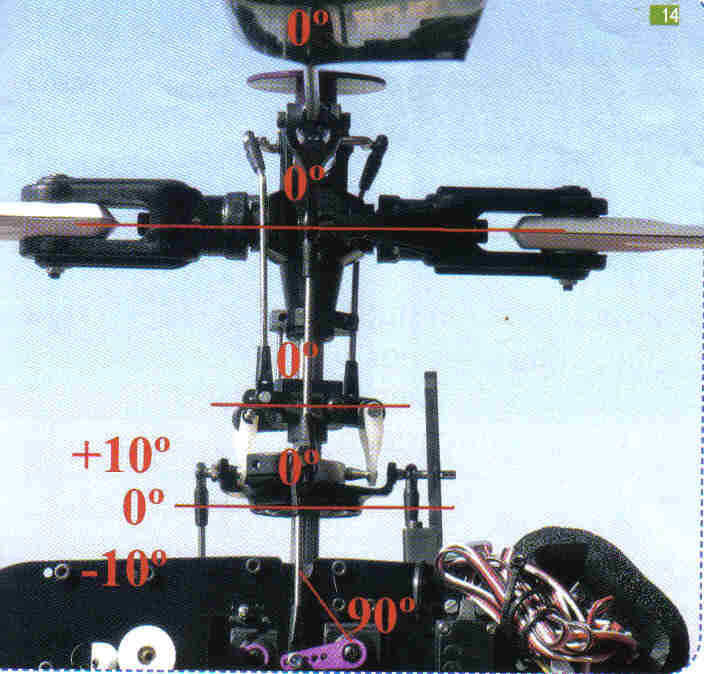 regular primero el paso, poniendo +5º en las palas con el medidor, y ajustando la longitud del brazo hasta hacerlo coincidir con los 90º del brazo del servo y el stick de la emisora en medio, y una vez conseguido esto, realizar la misma operacion, con el alaveo y profundidad, consiguiendo dejar el plato completamente nivelado con los sticks de la emisora en el medio y 5º positivos en las palas.