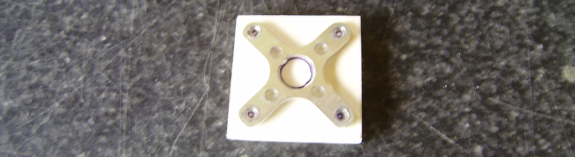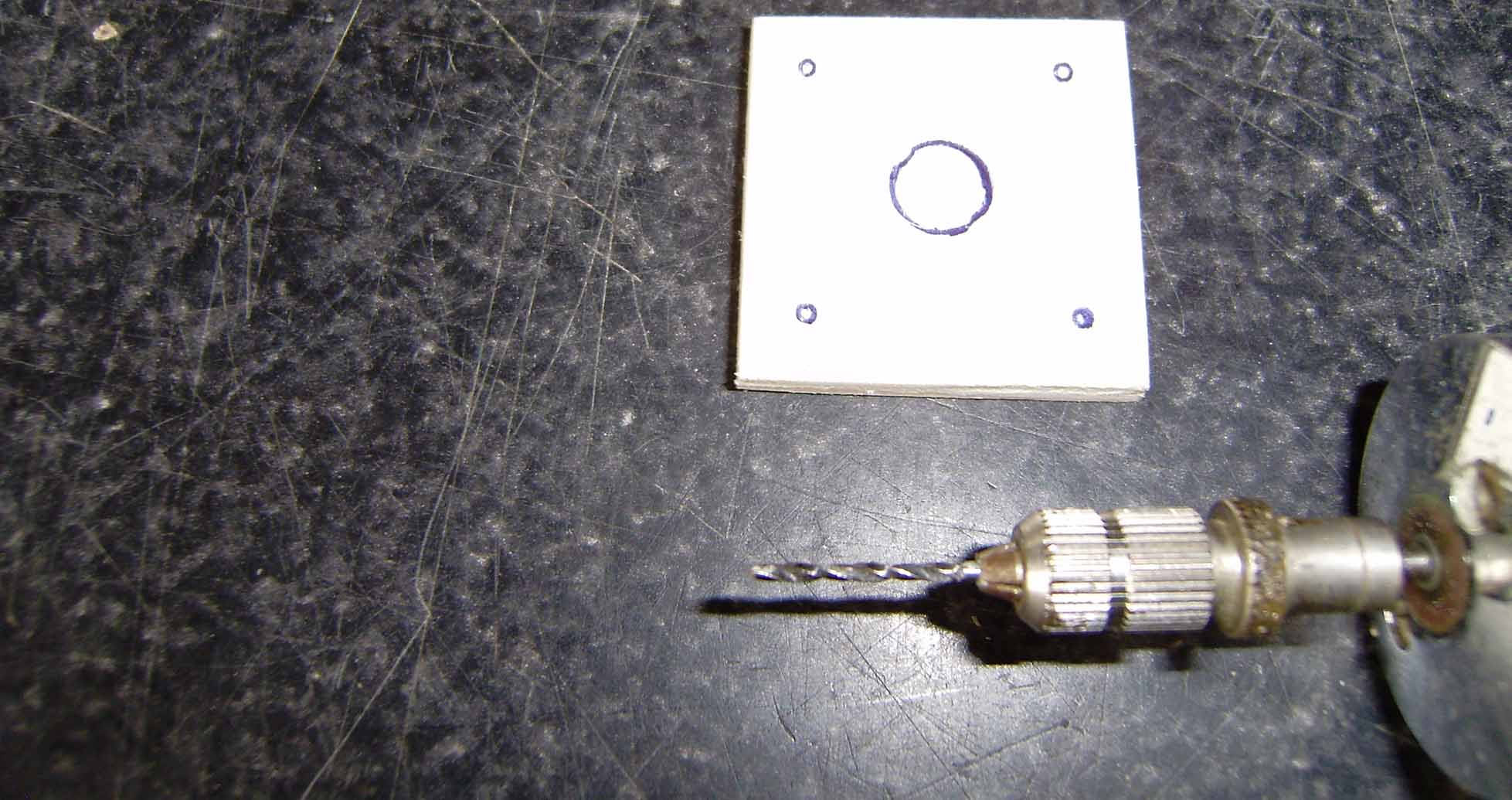 Colocamos la cruceta encima y marcamos.Luego con una broca de 1,5 mm taladramos los 4 puntos para los tornillos de sujeccion y con una broca del 8 taladramos el del centro para que pase el eje del motor.