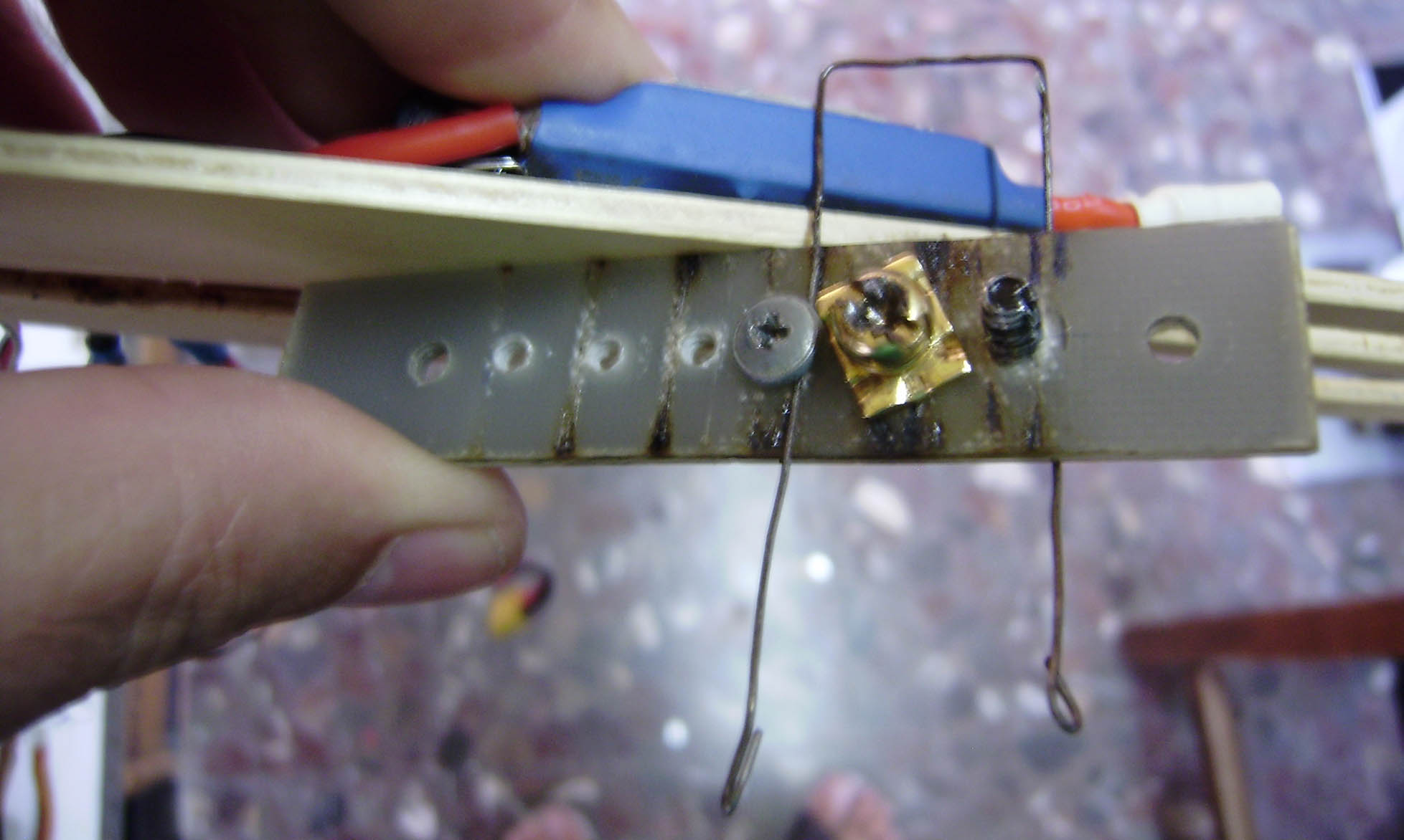 --Ponemos los dos horns en un gato para abrir el agujero de mando de 1 0 1,5 mm,para la barilla de mando.Segun lo alto que se haga el brazo,se pueden abrir varios agujeros.