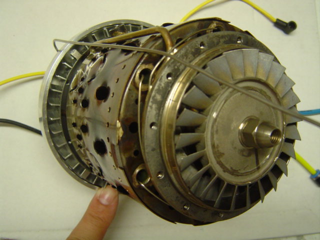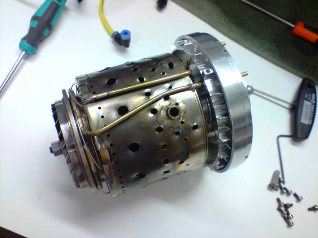 En mi Simjet 1700 el gas no se inflama de forma normal, he desmontado la turbina y he comprobado que el tubo de gas entra por una esquina delantera de la cámara de combustión y apenas se introduce 1cm, terminando de forma plana. En la foto señalo con el dedo la entrada del gas y podeis ver en la parte superior de la turbina la toma de la bujia.