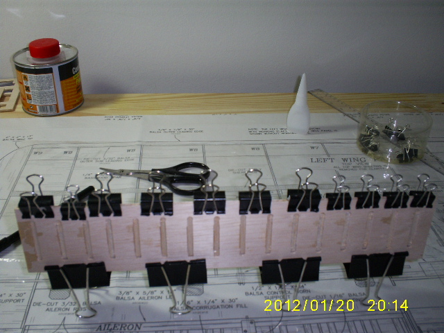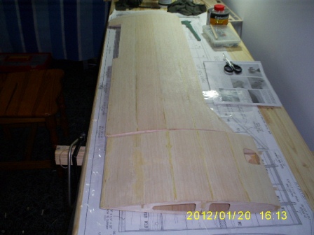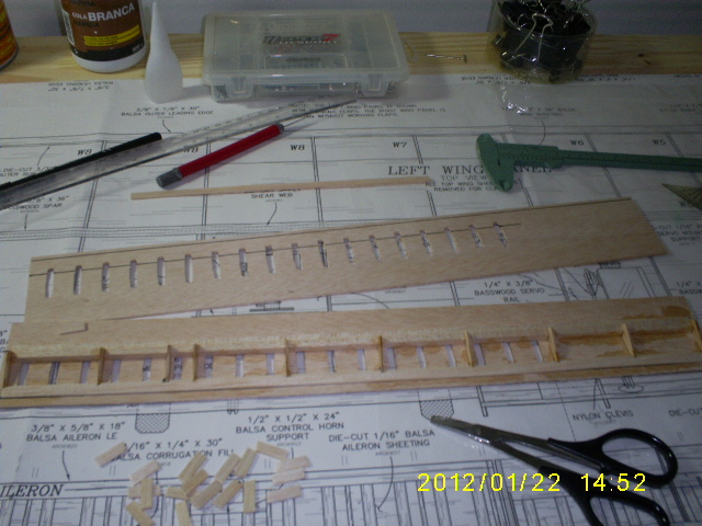 otras imagenes del armado del ala. principal comunmente hay que terner cuidado con la humedad tienden a doblar el ala en su tiempo de secado del pegamento , ya que yo aplico cola de agua llamada cola de carpintero , es mas flexible para las torciones , las punteadas son con ciano crilato , thin y ya despues donde requiera su respetiva cola o pegamento. poco poco vamos extendiendo el armado .