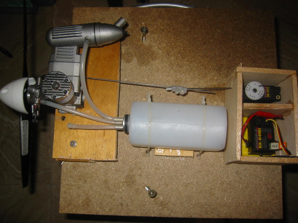 supongo que construyéndola pensando para motores mayores puede servir. A mi me va de primera, se fija en una mesa de madera bien atornillada, las maderas que hacen de bancada bien fijas, un receptor reciclado, tiene la antena partida, una batería normalita, el serbo reciclado de un avión de mi hermano, el deposito, recuperado de un siniestro, bien fijo y el cable de serbo a gas unido por una regleta.