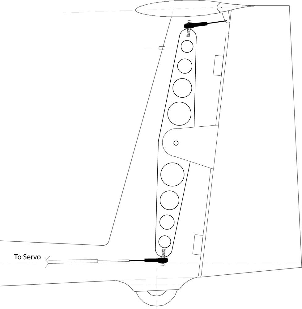 EL fuselaje es de fibra y viene ya montado y cerrado, con una transmisión tipo bowden que va desde la parte delantera donde va el servo de profundidad, , hasta la parte superior de la cola, donde está el estabilizador verticar. El problema es que la transmisión hace una curva pronunciada dentro del estabilizador vertical (para poder llegar a la parte superior), y cuando acciono el servo para moverlo hacia abajo, la superficie de mando baja, pero al soltar el stick, la superficie de mando sube pero se queda a unos 4 grados. Si le doy un toque de stick hacia arriba, al soltar si se queda en los 0 grados. Cuando acciono el stick todo hacia arriba, la superficie vuelve correctamente a su posición.
