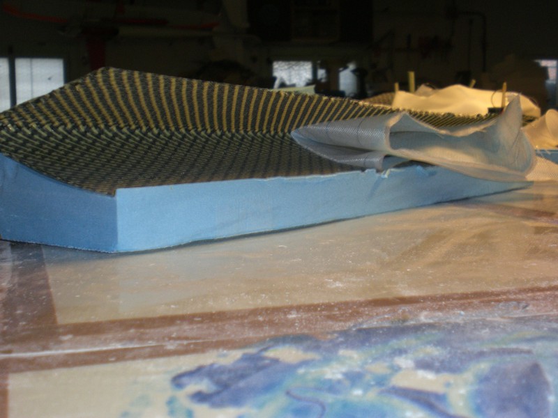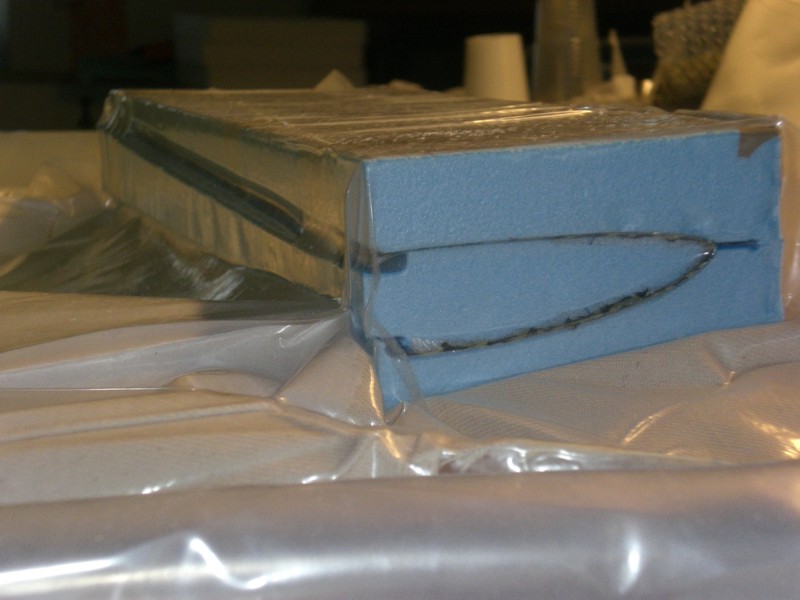 Necesitas poder cortar un núcleo de espuma con una calidad aceptable, tan fiel al perfil como el D-Box que quieras obtener. A este núcleo le hago una ranura de 10mm a partir del punto (0,0) del perfil para que tenga holgura tanto la pate del extradós como del intradós para poder prensar el Mylar. Pondrás el tejido sobre el Mylar y lo impregnarás sobre él para evitar burbujas, añades el peel-plie y colocas todo sobre el foam. Todo el conjunto lo metes en el negativo del foam, apretando para que se ajuste... pero poco. Cuando hagas el vacío deberás apretar 'a tope' el núcleo contra el borde de ataque para que no quede hueco, y dejar actuar al vacío.