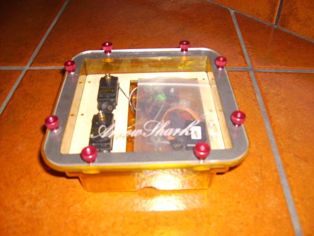 el equipo de radio consta de un receptor futaba, un fai-fase, bateria de 6v y 2 serbos de 15 kg cada uno