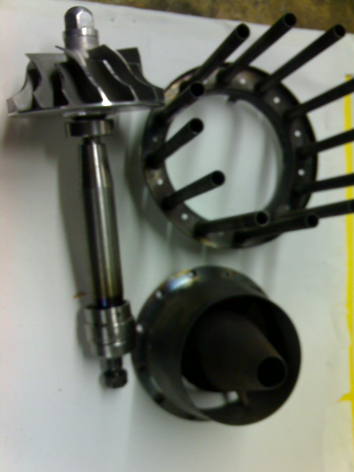 Gracias por vuestra ayuda. Os pongo más fotos. Cuando la probé, aparte de lo de la temperatura , más de 1000 ºc, solo daba 5 kg de empuje. El diametro externo es de 115 mm. Haber si hay alguna forma de que funcione, sin que se estropee. La turbina iba bien, pero al cabo de varios arranques, a 105000 rpm, comenzaba a chirriar un poco, y tenia que bajar rpm, al cabo de otro rato, a menos rpm hacía lo mismo y así sucesivamente a menos rpm. Al final la paré y vi el cojinete de escape muy negro.