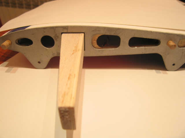 Bueno las alas superiores ya las tengo terminadas, una vez avisagrada, procedemos a pegar una costilla fabricada en aluminio esta esta hecha en este material, ya que el ala va cojida a los cabanes con dos tornillos, y se esta fuese de contrachapado (terciada), los tornillos de 3 milimetros nos podrian rasgar la madera dando al traste con el ala superior en pleno vuelo.