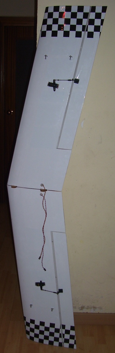 Lo de los alerones es practicamente por obligacion.Me hubiese gustado ponerlos algo mas rectos,pero el refuerzo que trae para poner,tanto los servos,como los "horns",te obligan a ponerlos asi(o a desmontar y colocar a tu gusto,pero eso es mucha faena...).En cuanto ponga la centralita y el receptor,veremos si afecta,y como.Asi aprendemos todos un poco. :roll: