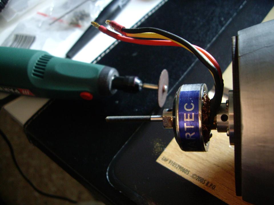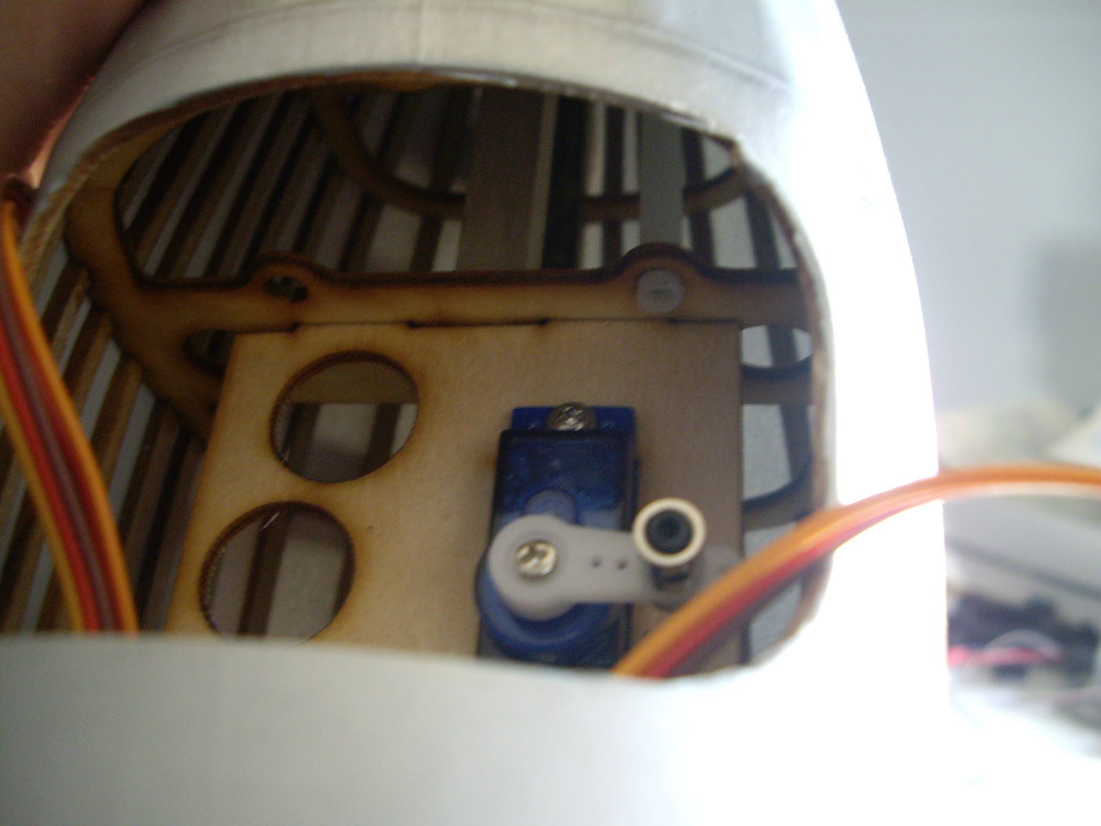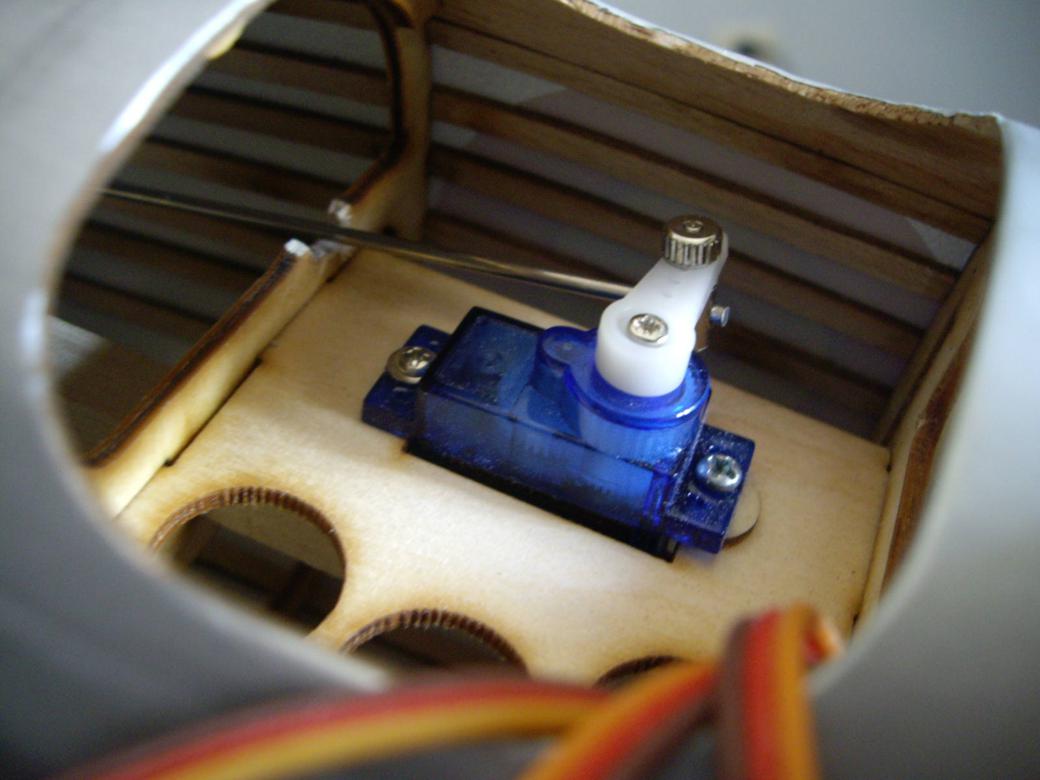 Prueba a doblar un poco el brazo de plástico del servo, si notas que aún así la transmisión "va dura"; simplemente tienes que calentar ligeramente con el mechero e ir forzando poquito a poco, hasta conseguir el ángulo deseado (yo calentré el brazo, por lo menos, 4-5 veces). El piloto es todo un acierto (fruto de la casualidad); y el motor espero que quede de cine :twisted: .