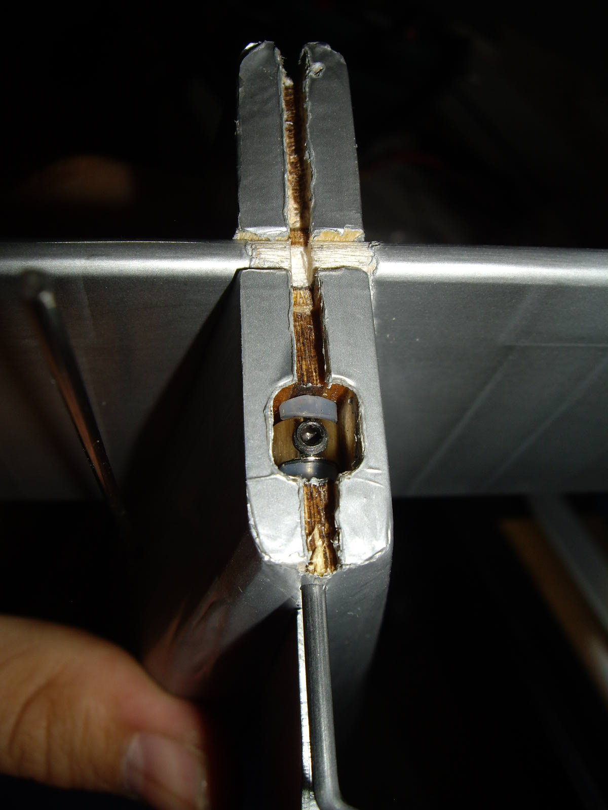 1º Podéis observar cómo he calzado el servo con una arandela de madera, para dar inclinación al brazo, y así no tener que doblar la transmisión de acero.