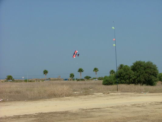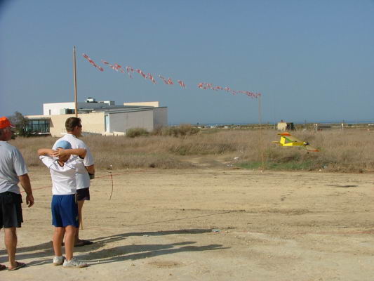 En el tema de los postes de los pilones es mucho más sencillo de evitar roturas del avión. Son dos cañas de pescar de fibra de 8 metros colocadas en un soporte de los usados en la misma diciplinas. Al tocar un avión las cañas, la vibración que le genera hace que se caiga :D y el avión sigue volando sin problemas. :evil: En mi club hay más de un listo que va a buscar las cañas cuando las ponemos y me tienen harto de repararlas. :wink: