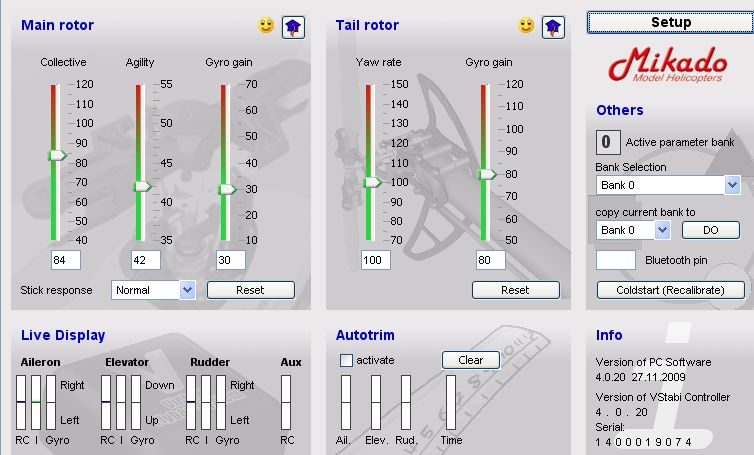 El tema de la necesidad de calibrar la emisora, es porque las emisoras normalmente tienen la señal neutra en 1520 usec (microsegundos), y el vstabi tiene un centrado diferente (creo que a 1500 usec), de ahí la necesidad de calibrar todas las emisoras para que la señal neutra coincida.