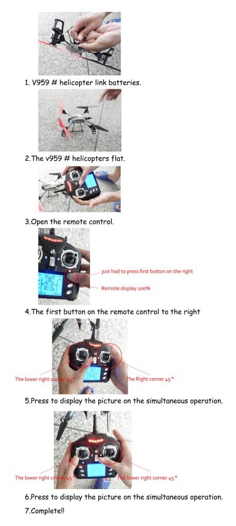 No dispongo de V959 para confirmarlo, pero en el caso del V929 te puedo decir que cuando el mando está encendido antes de conectar batería al heli, no se rejusta horizontalidad y la luz de placa base se queda encendida fija en cuanto el heli enlaza con el mando.