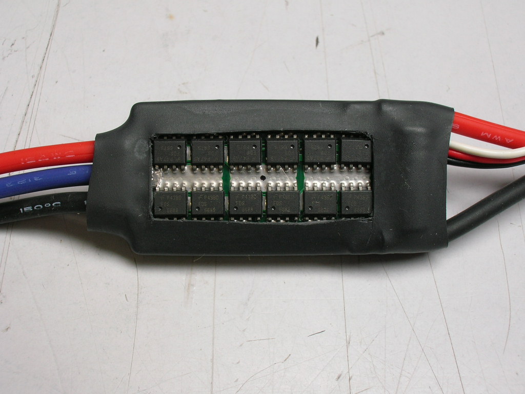 Despues de cambiar a una bateria más potente y más pesada (bestia pack 2300mAh) aparecieron los problemas de cortes del variador. Decidí entonces aumentar la superficie del disipador del variador y me lleve la sorpresa: dos de los mosfet y la mitad de otros dos, quedaban fuera del disipador, con el riesgo de destrucción de estos mosfet. Busqué otro disipador más grande, uno sin adhesivo con su lámina de silicona sujeto con elástico o bridas, (se puede utilizar uno con adhesivo térmico, de los que se usan en los chips de ordenadores, por ejemplo de "revoltec", "thermaltake" etc o un disipador pegado con pegamento térmico) y coloqué el BEC en buena posición de ventilación y adiós problemas.