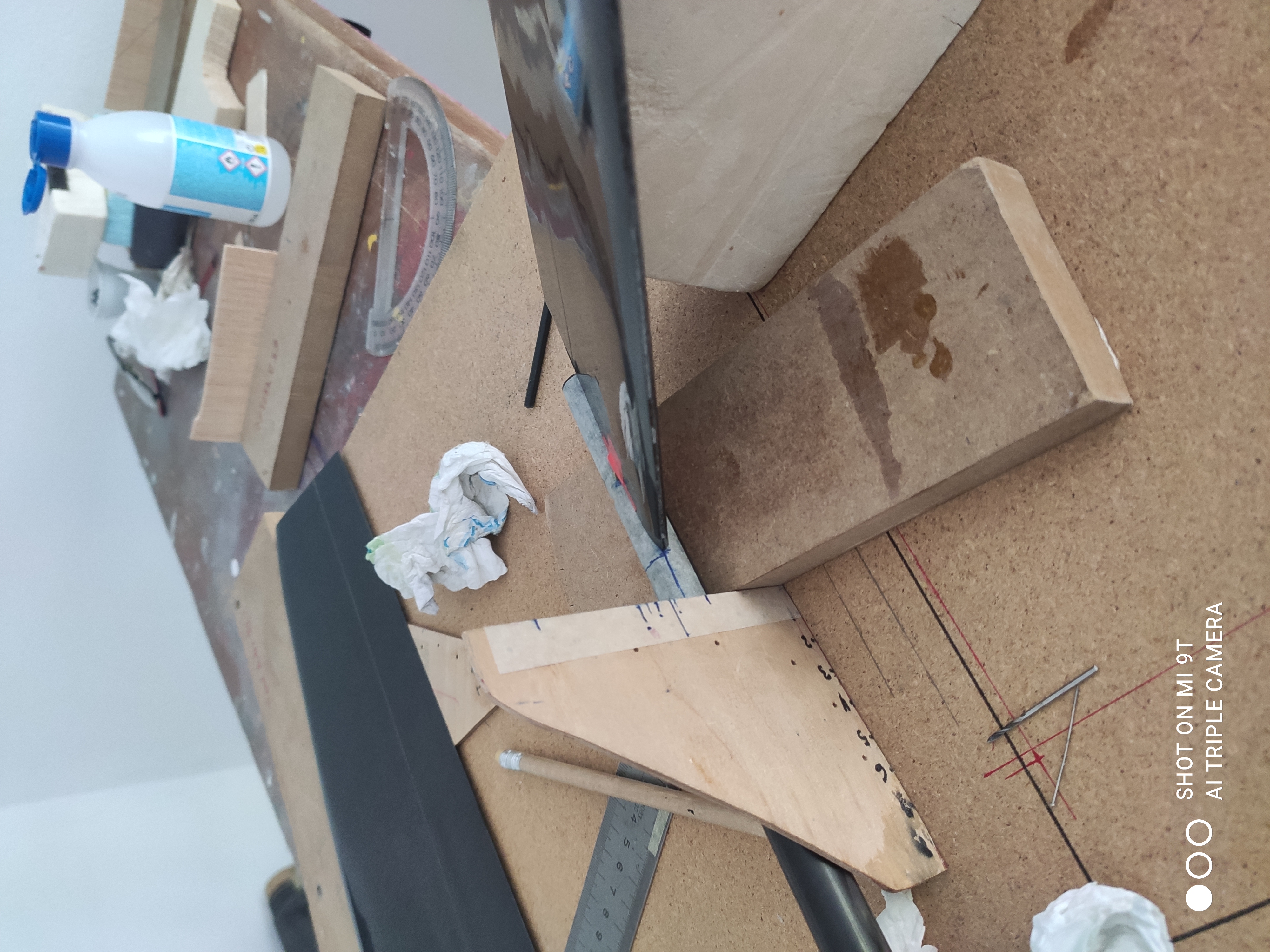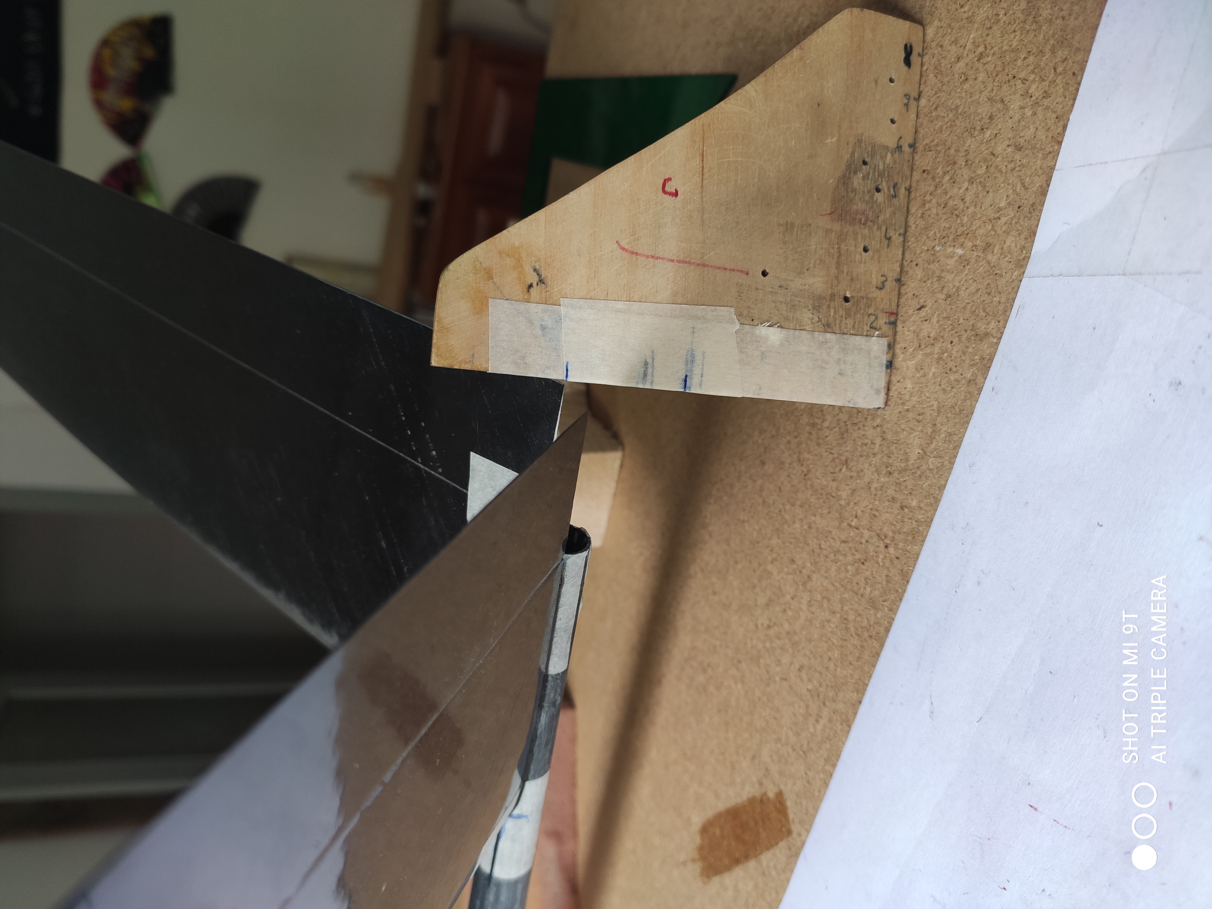 Los medidores de incidencia se colocan muy mal por la fuerte inclinación y dan medidas erróneas, así que a fabricarse una escuadra y hacer una marca para medir la altura de borde de ataque y de salida. Cuando coincidan las 2, tendremos un estabilizador a 0 grados.
