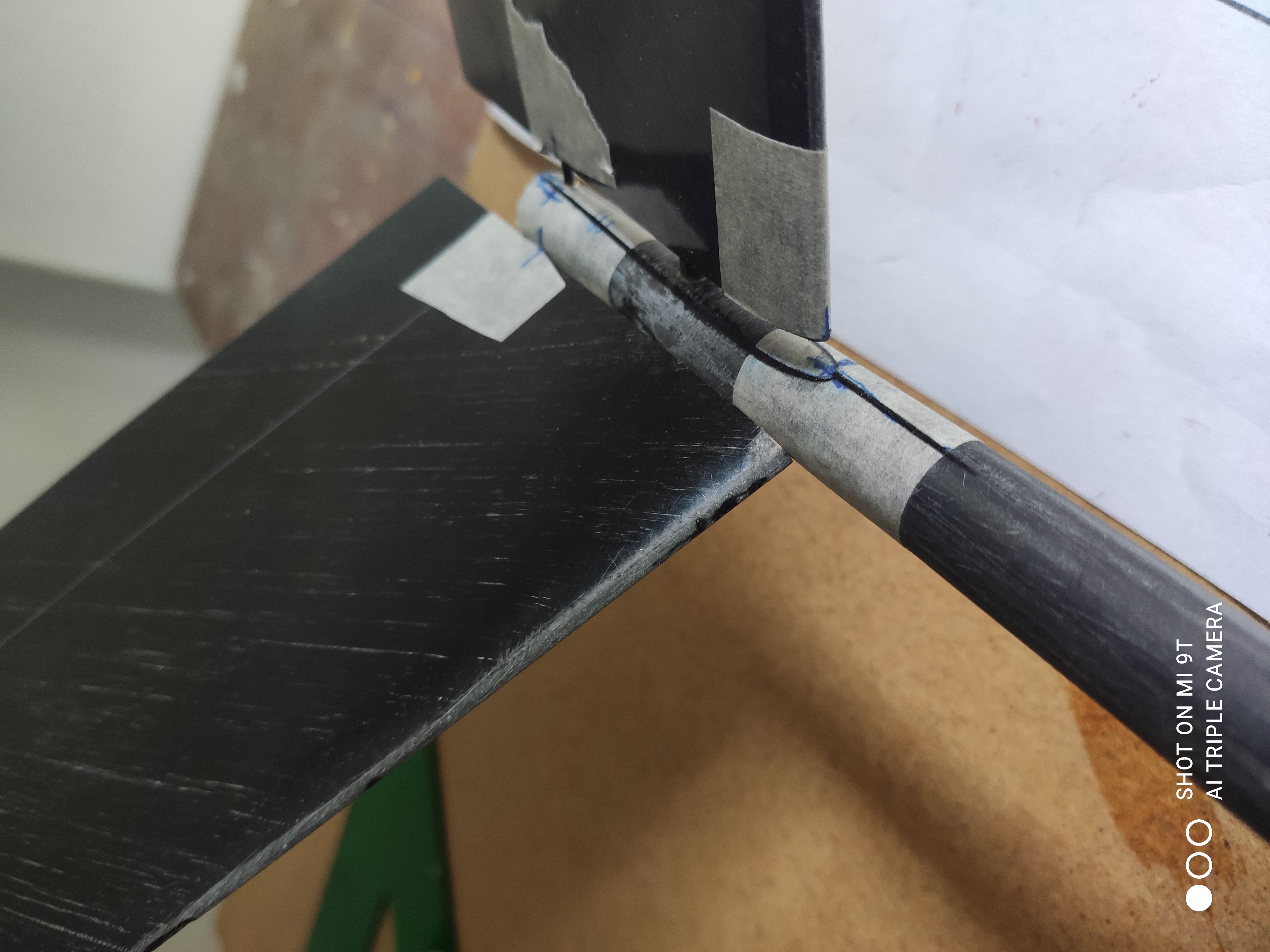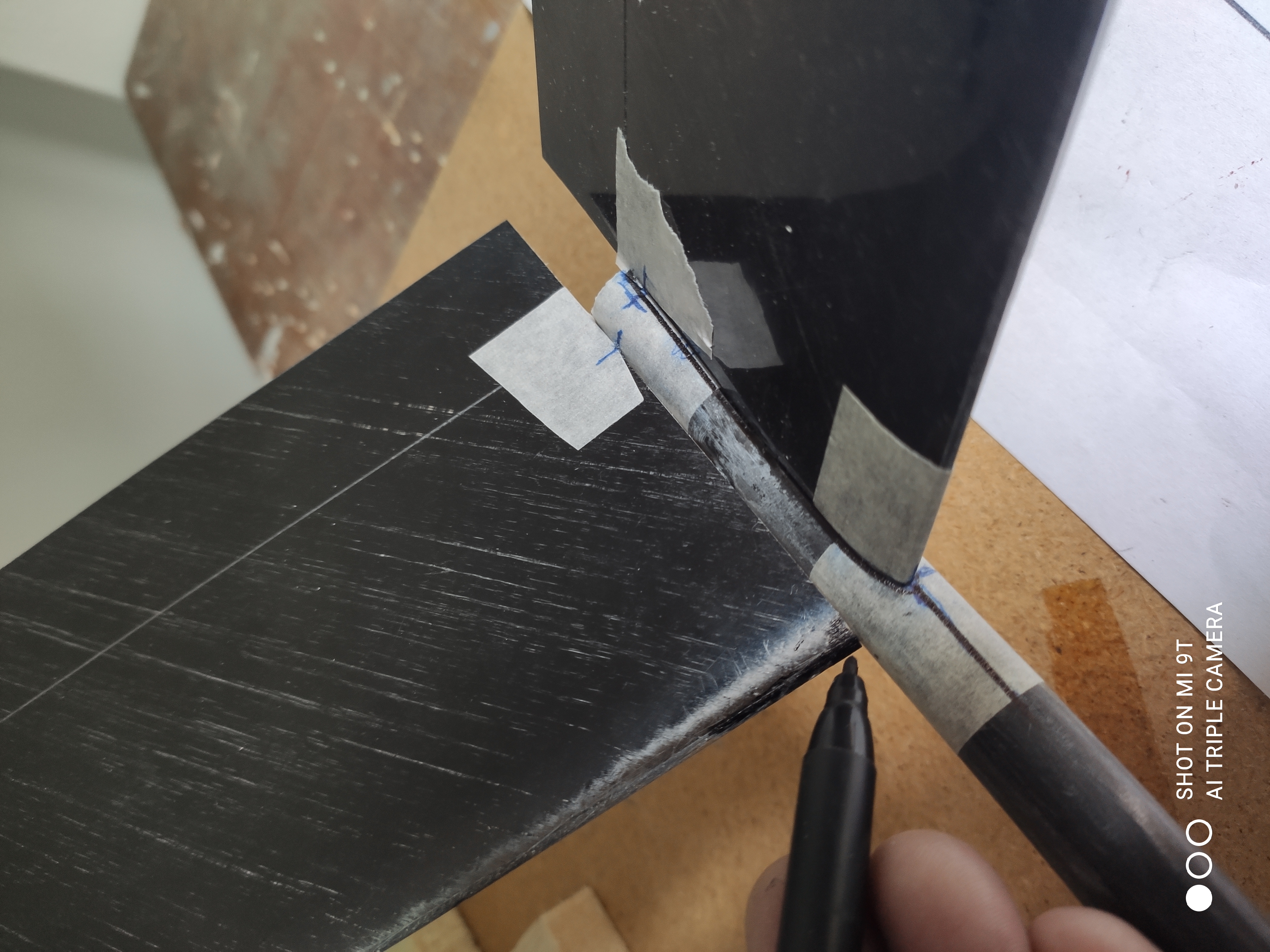 Con el rotulador marcamos la línea media del borde de ataque y de salida en la cinta de carrocero y además aprovechamos para pintar un pequeño desperfecto en el b.a.