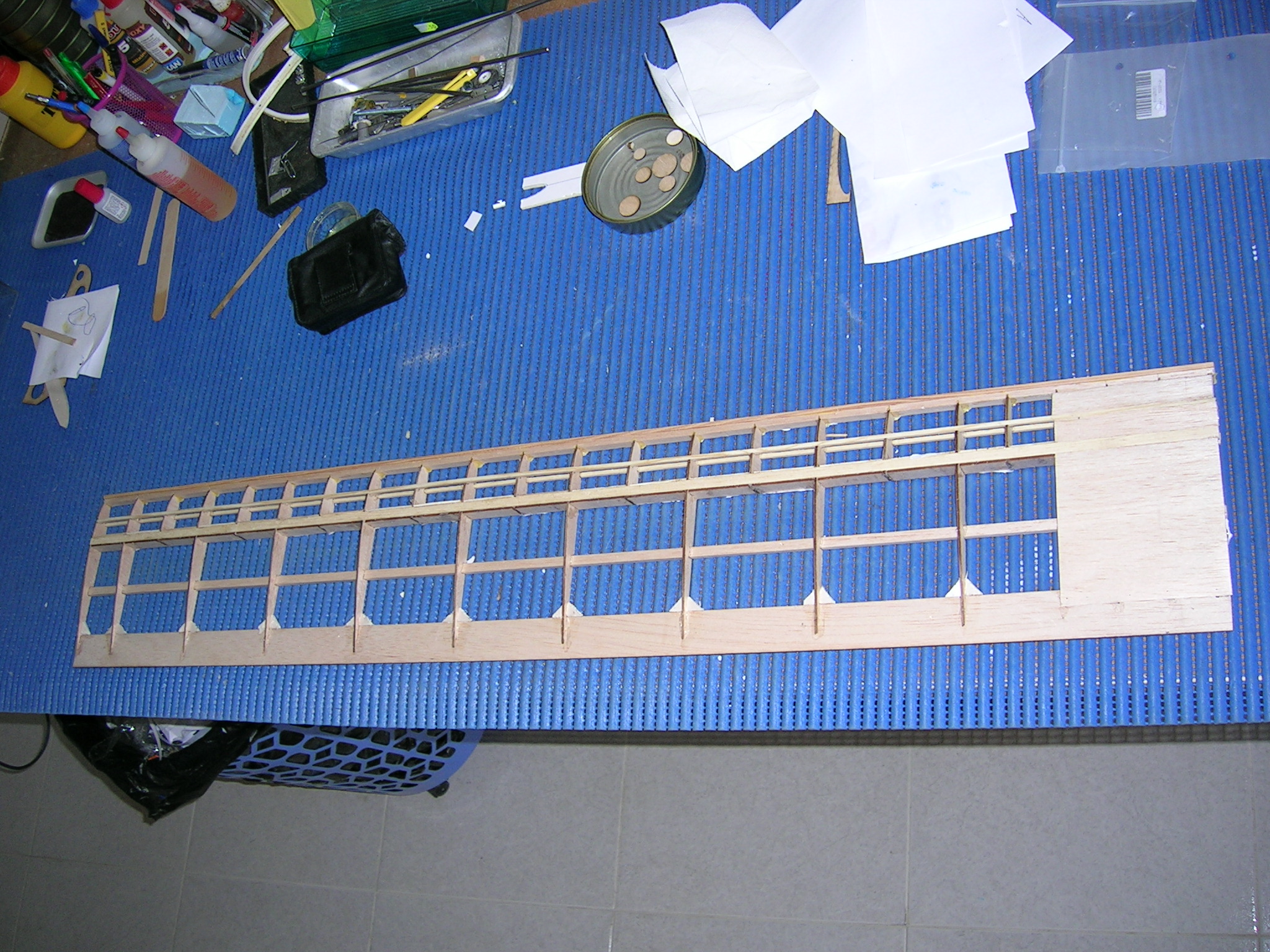 Comenzamos el montaje del fuselaje pegando primeramente los listones de la parte ventral y del lomo, pegando entre ellos las piezas rectangulares de refuerzo.