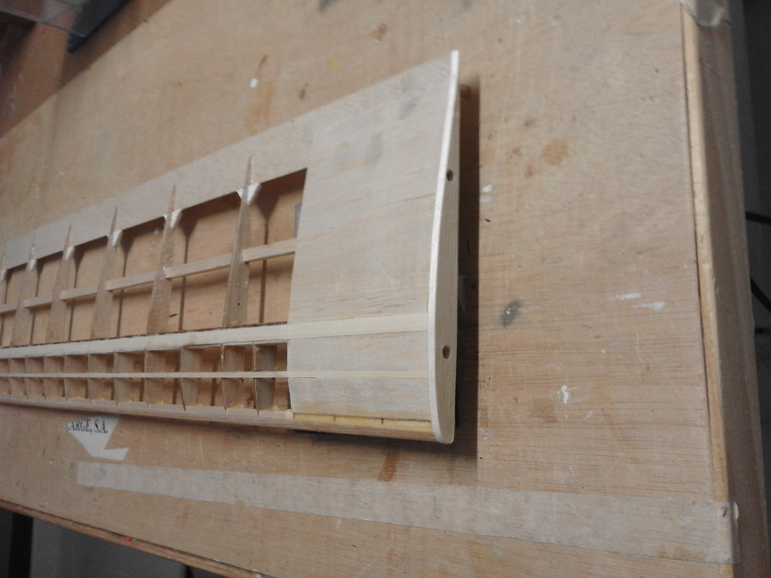 Bien, el Kokaze poco a poco va avanzando en esta foto muestro la colocación de los marginales, no tienen ninguna complicación mas que hacer unas pequeñas piezas de balsa a modo de cuñas para darle fortaleza. Igualmente se levanta el extremo con el ángulo marcado en el plano