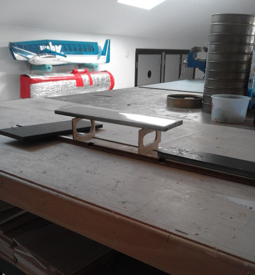 Puedes sacar la cuerda media y siendo el Kokaze de cuerda constante es más fácil, una véz tengas la cuerda media en cada semiala colocas justo debajo de la marca de cuerda media algún soporte que te dé por lo menos 30cms para que el ala quede suspendida. Con el ala soportada comienza a colocar peso en el centro, un velero con las dimensiones del Kokaze debe soportar hasta 3g y -2g de carga en la estructura que no tiene nada que ver con la carga alar es un prueba estructural. Si la estimación del peso en orden de vuelo es de 800grs en teoría la estructura debería soportar hasta 2,4kg. OjO, este tipo de cosas se hacen normalmente con nuevos diseños para comprobación estructural, en un viraje normal con banqueo a 20 grados y velocidad de 30km/h fácilmente se llega a 2g al compensar con profundidad, un poco más si se lleva el motor encendido al igual que con un ascenso por encima de 15 grados de ataque con el motor encendido a tope.