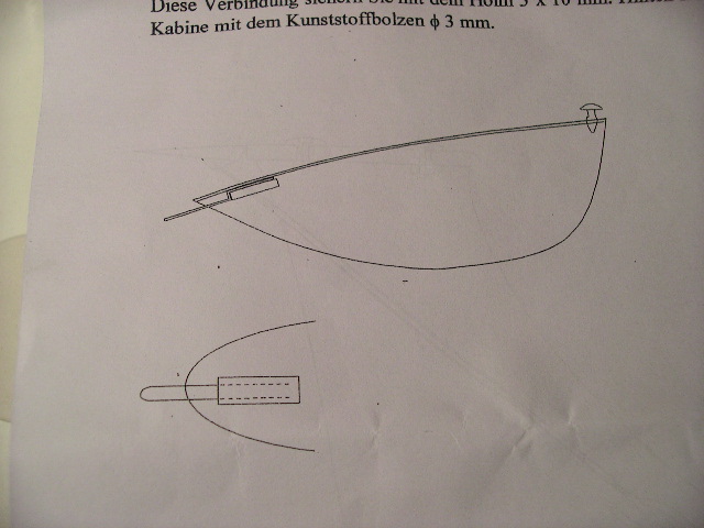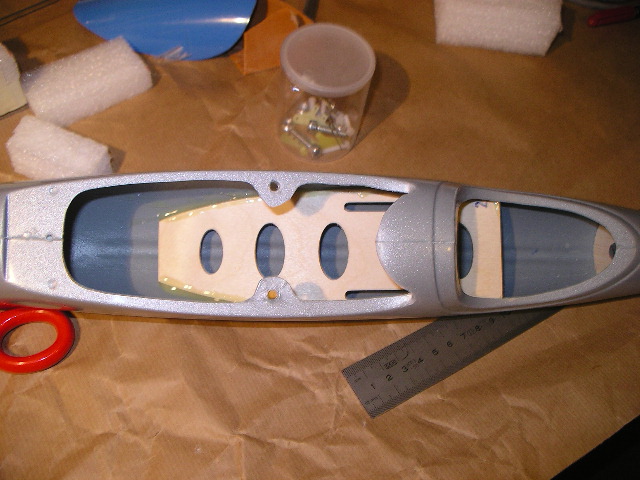 De momento he decidido no poner ninguna de las dos bancadas que vienen para el motor y sustituirla por una doble pieza de balsa hecha a medida con un tornillo M6 pasante que me servirá para ponerle anillos de plomo como contrapeso y un spiner que me haga de embellecedor sin hélice. He pegado la bancada que viene para las baterias (inclinada, como en el plano), despejado de porexpan los huevos de los servos del ala, realizado el agujero para pasar la transmisión del servo de cola y poco más puedo hacer hasta que no me lleguen los servos. Ahora iba a poner el sistema de fijación para la tapa de la cabina pero como veo que muchos de vosotros poneis una simple cuerda de piano, me gustaría que me aconsejárais que opción es mejor y como se hace, porque después de ver varios post no me queda claro (curvatura del alambre, enganche, etc).