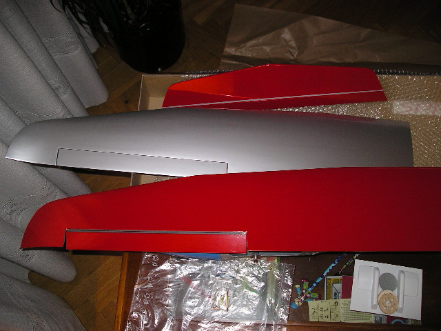 El avión me ha parecido de buena calidad con alas sólidas, bien terminadas y fuselaje en fibra aunque ni por asomo tan duro como otros que he visto. Eso sí tiene un refuerzo ventral que le aporta dureza extra en la panza y que junto con la bancada de contrachapado creo que quedará bastante sólido. Las instrucciones parcas y en alemán aunque la verdad es que no las solicité en inglés . De todas formas no creo que requiera mucho explicación lo que queda por montar. Los accesorios son la bayoneta en fibra de vidrio maciza de 8 mm, tornillos M5 para la fijación de las alas y M3 de nylon para el timón de profundidad, transmisiónes de alerones, transmisión de cola, cubreservos, arandelas, fijación de la cabina, horns y pegatinas.