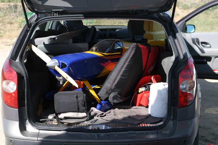 Bueno no pongo las fotos para competir en quien mete el avión más gordo dentro del coche, pero si la pongo para que veais como suele ir a volar un servidor.