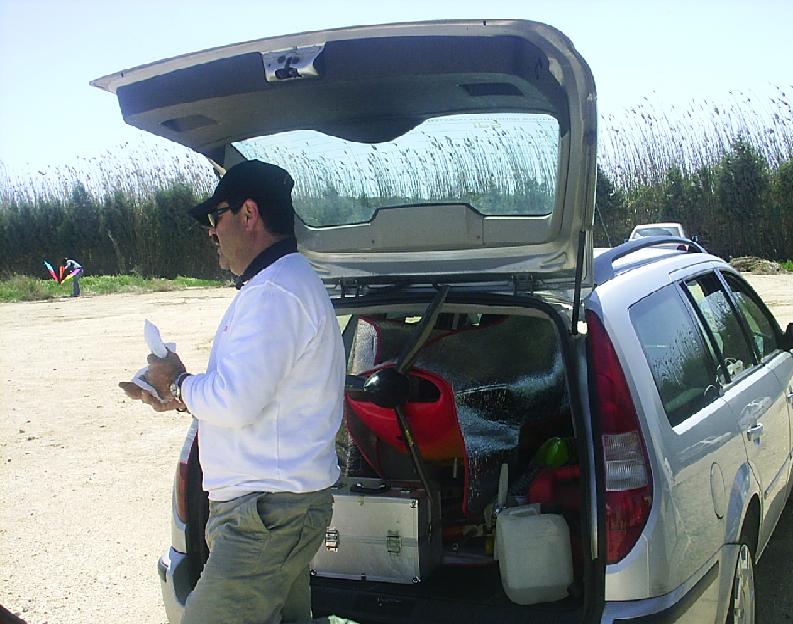 Normalmente me lleva otro compañero Dani (Aerodan aqui). Vamos en su Renault 19 con los asientos plegados y su Axis, mi Diablotín, su Zoom Zoom y o mi Zoom Zoom o el FoameII mas toda la infraestructura.