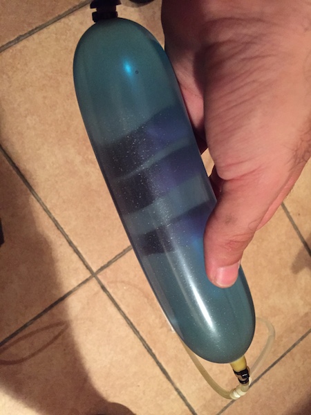 Adjunto fotico del "nuevo deposito" del funjet, he dejado de usar el deposito de plástico con globitos dentro (los globitos duraban un par de días y se jadian con el metanol) por un tubo de latex de 9mm interior 12 exterior (1.5mm de pared), inflado de combustible es ligeramente mas grande que el interior del funjet, así que hay que quitarle algo de EPP a las paredes interiores, se puede llenar exactamente con 350cc, si lo lleno mas no cabe dentro del fun jet por longitud, el diámetro no aumenta. He probado con varios tubos de latex y este es el que mas me ha gustado.