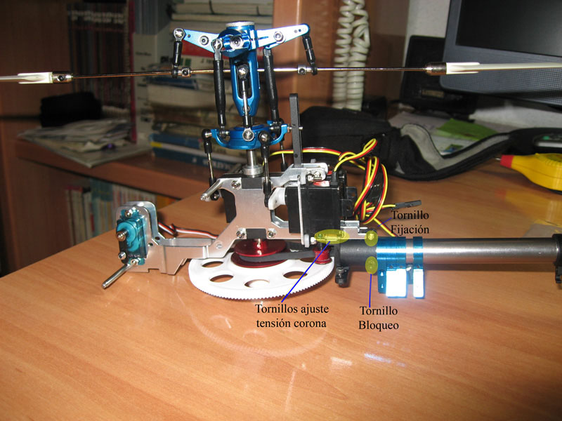RESUMIENDO : Para el montaje, previamente hay que desmontar el servo original y todos sus brazos, varillas y soportes. Separar la parte alta del helicóptero (dónde vá el motor, la swashplate y la cola), de la parte inferior (cuerpo cuadro de aluminio y patines). Después, aflojar la cola de la parte rotor y quitarle tensión, para poder aflojar la correa dentada de cola y sacarla de la corona del rotor, obteniendo así la longitud suficiente para retirar el tubo de aluminio de la cola de su lugar de encastre. Una vez conseguido esto, se introducen los dos soportes del kit en la cola (tienen una ranura pòr la que se puede librar la correa dentada) y se procede a montar de nuevo el helicóptero en orden inverso. Se monta ahora el servo en la cola, se ajusta la distancia y conecta el brazo del servo directamente con una varilla. Se ajusta el movimiento del servo y se comprueba el buen funcionamiento.