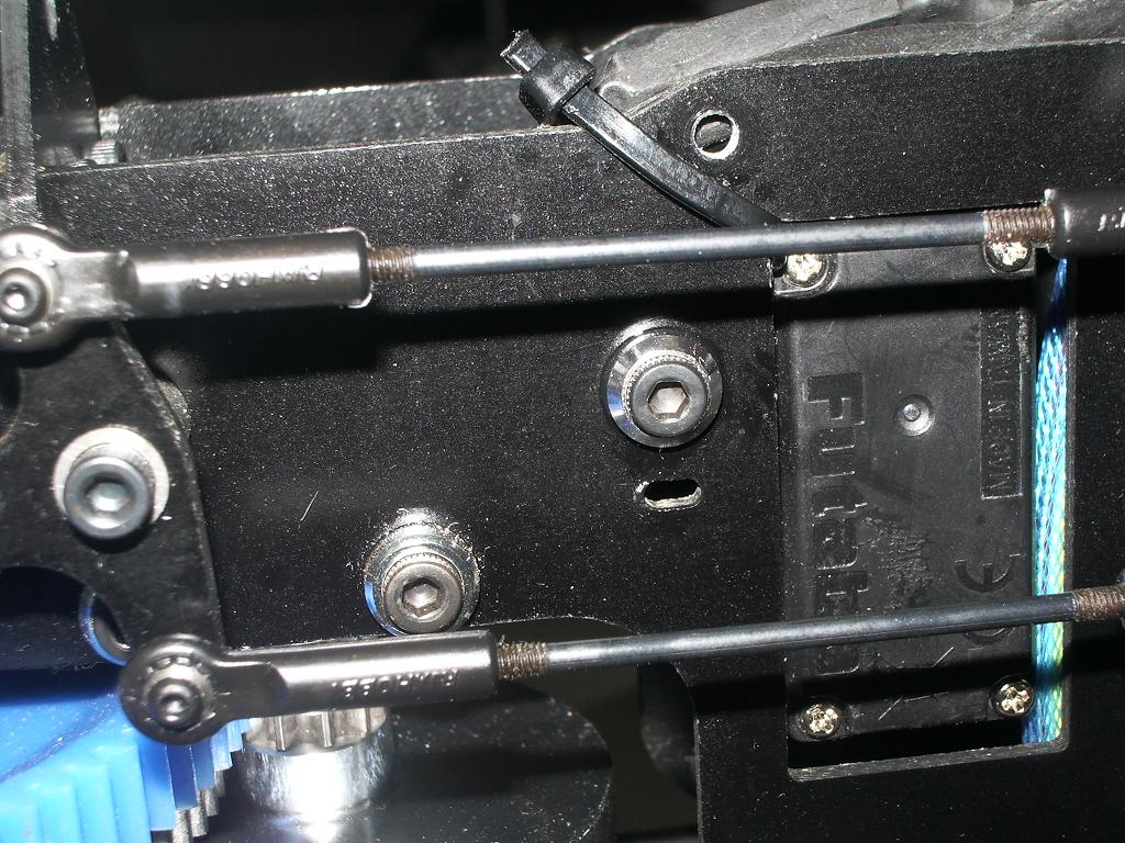 Cuando tengas los servos nivelados, ajustas las varillas que van a los servos para que las piezas de aluminio esten a 90º con ellos, cuando lo tengas ajustas las varillas que van al plato ciclico para que tb este nivelado, luego las que van al washout y sessaw, etc..